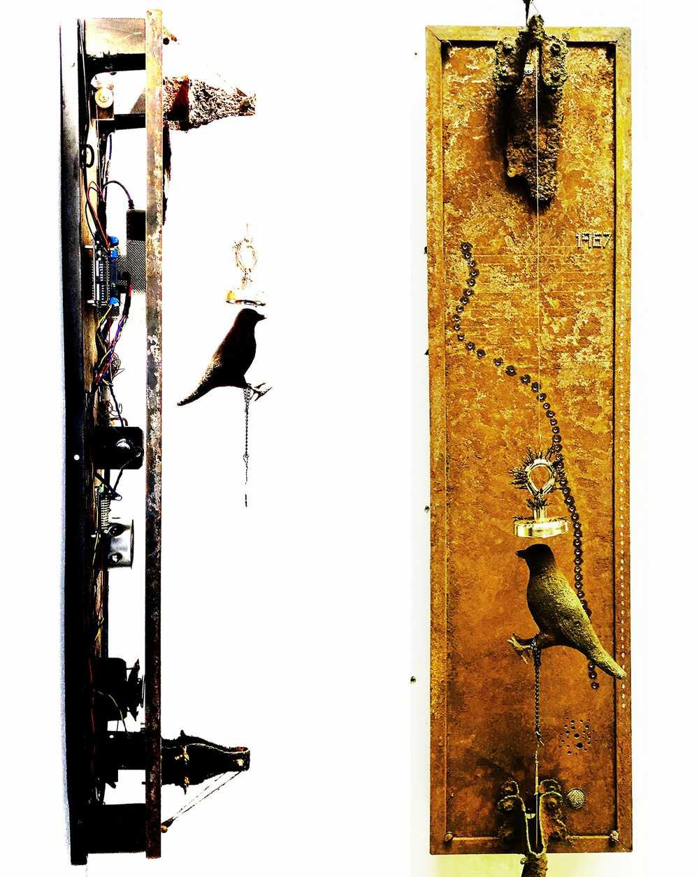 Human presence triggers a motion sensor which starts the song of the Skylark and the physical decent of the iron replica suspended, mid air, by a magnet until the song fades giving way to the rev of a tractor.