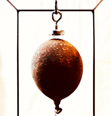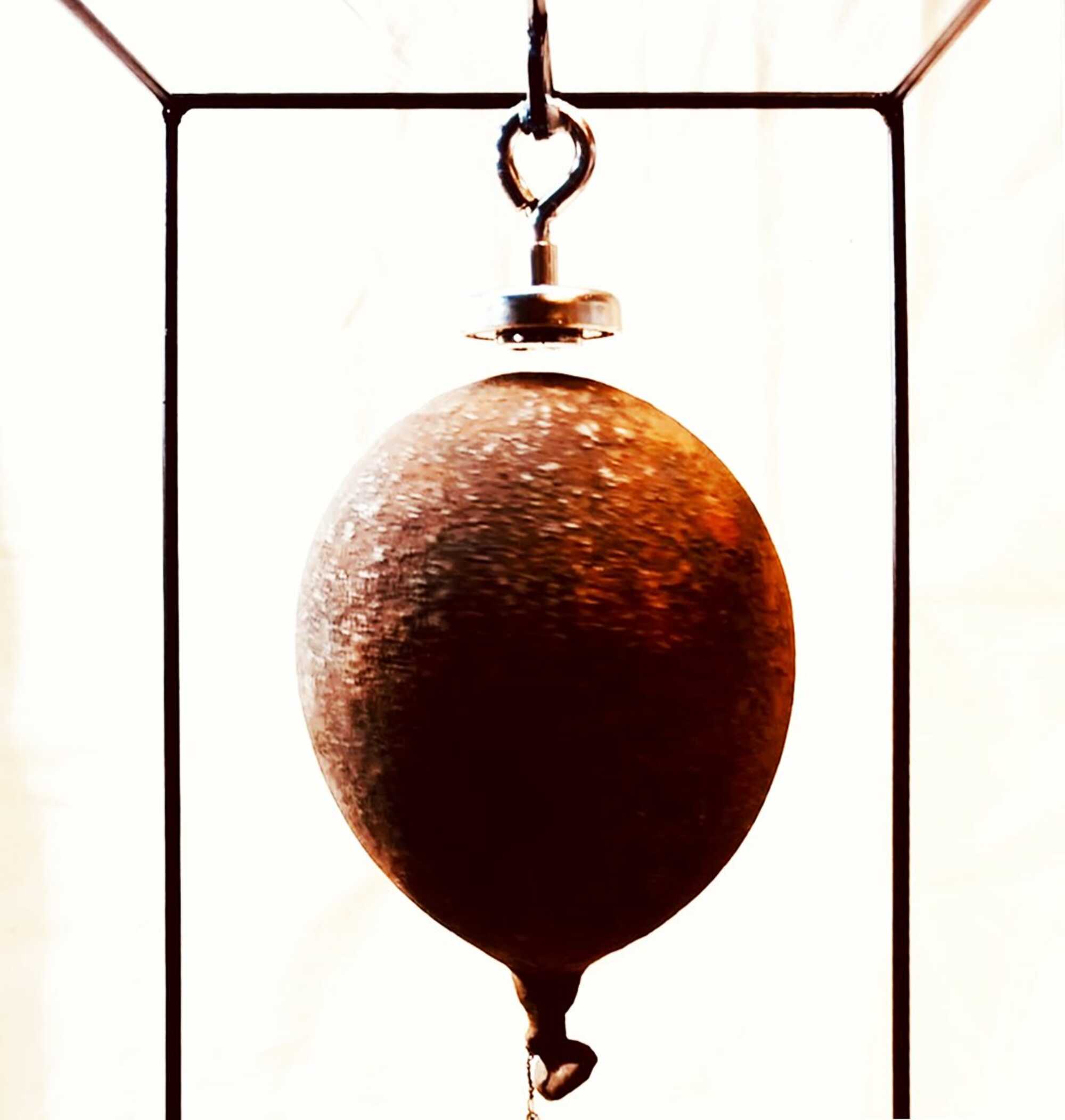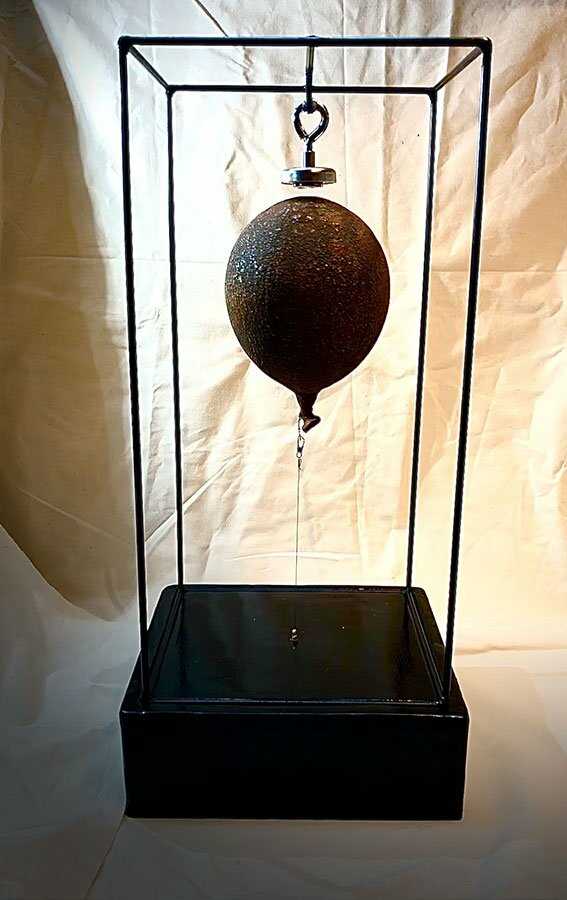 An iron balloon is held mid air by the strength of the magnetic field above fixed to the frame. In the base there are 2 motors, one to spin the balloon the other to make the whole base jolt when it slowly lifts and falls making the balloon jolt and almost fall. You can see it working here: http://richardpaton.com/jolt-3/