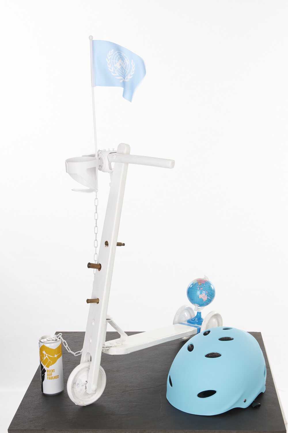 Im Juli 2019 fertigte der deutsche Künstler Roland Eugen Beiküfner für die Ausstellung "Wellen und Gedanken" ein Kunst-Objekt mit dem Titel "UNO-ROLLER" mit einem blauen Kinderhelm, einem weißen angestrichenen Holzroller, einer Kinder-Flagge der Vereinte Nationen, einem Mini-Globus, einer Dose mit der Aufschrift „Recht auf Faulheit„ auf einer schwarzen Steinfliese mit dem Hinweis „In Gedenken an Ruanda und Srebrenica“.
