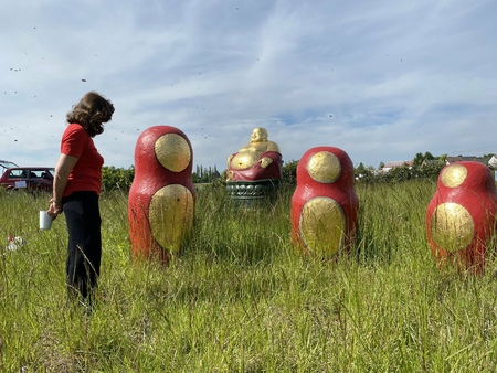 Kinder schauen in den Bauch des Buddhas. Das Bienenvolk ist vor 4 Tagen eingezogen. Die Fragen gehen durcheinander, so groß ist die Aufregung an den Fenstern in die Welt der Bienen. Skulpturen mit Bienen im Bauch; der Natur ganz nah. NATUR SEIN