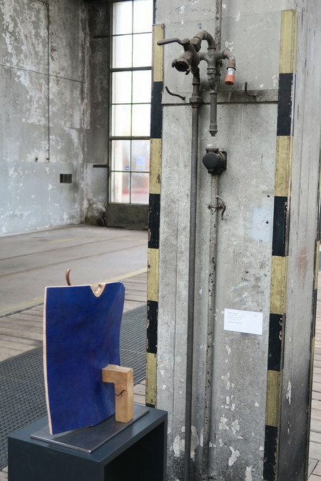 Sein Kupferstab ist seine Antenne zum Überirdischen; sein blauer Schild spiegelt den Raum; wirklich verbunden mit der Erde ist er nicht.