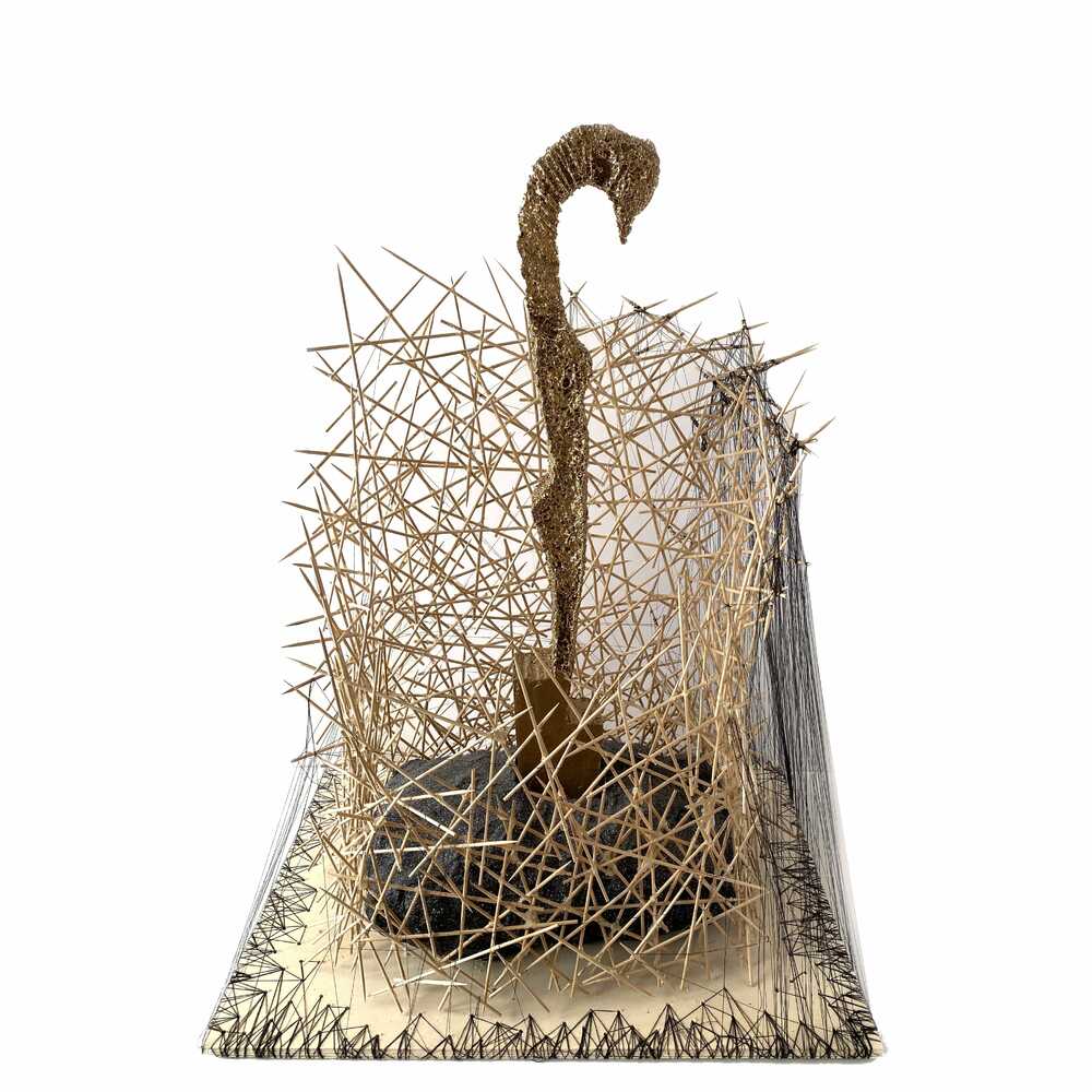 A bronze sculpture stands in the center of attention in the middle, representing a fusion between woman body and swan head. The material mix of wood, strings, plaster etc. are also thought after, as a wooden nest is not only fragile, in our case also transparent and exposed but also temporarily. As comments about women generally are often made that they just choose a certain type of man (mostly wealth ones) in order for the chance of getting "into a golden nest" but the complexity within the environment of women is way more complex.