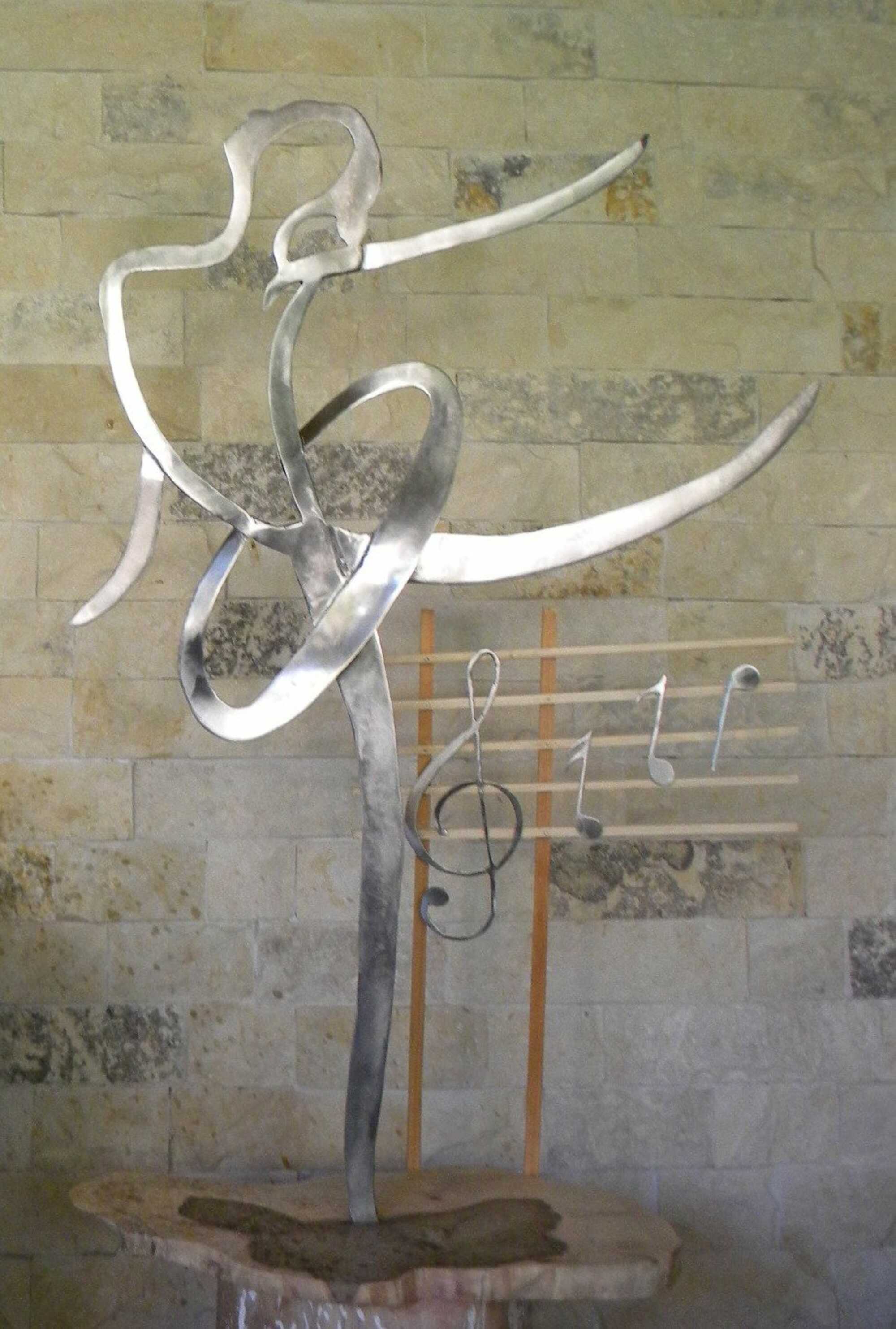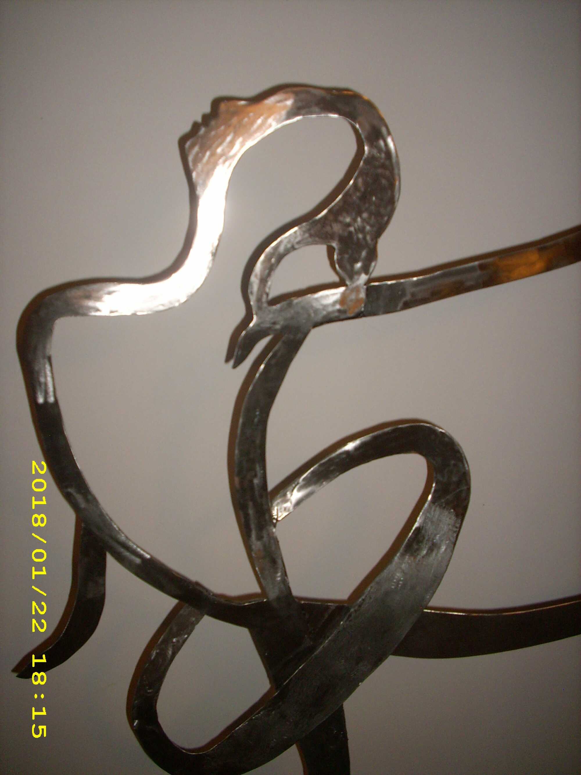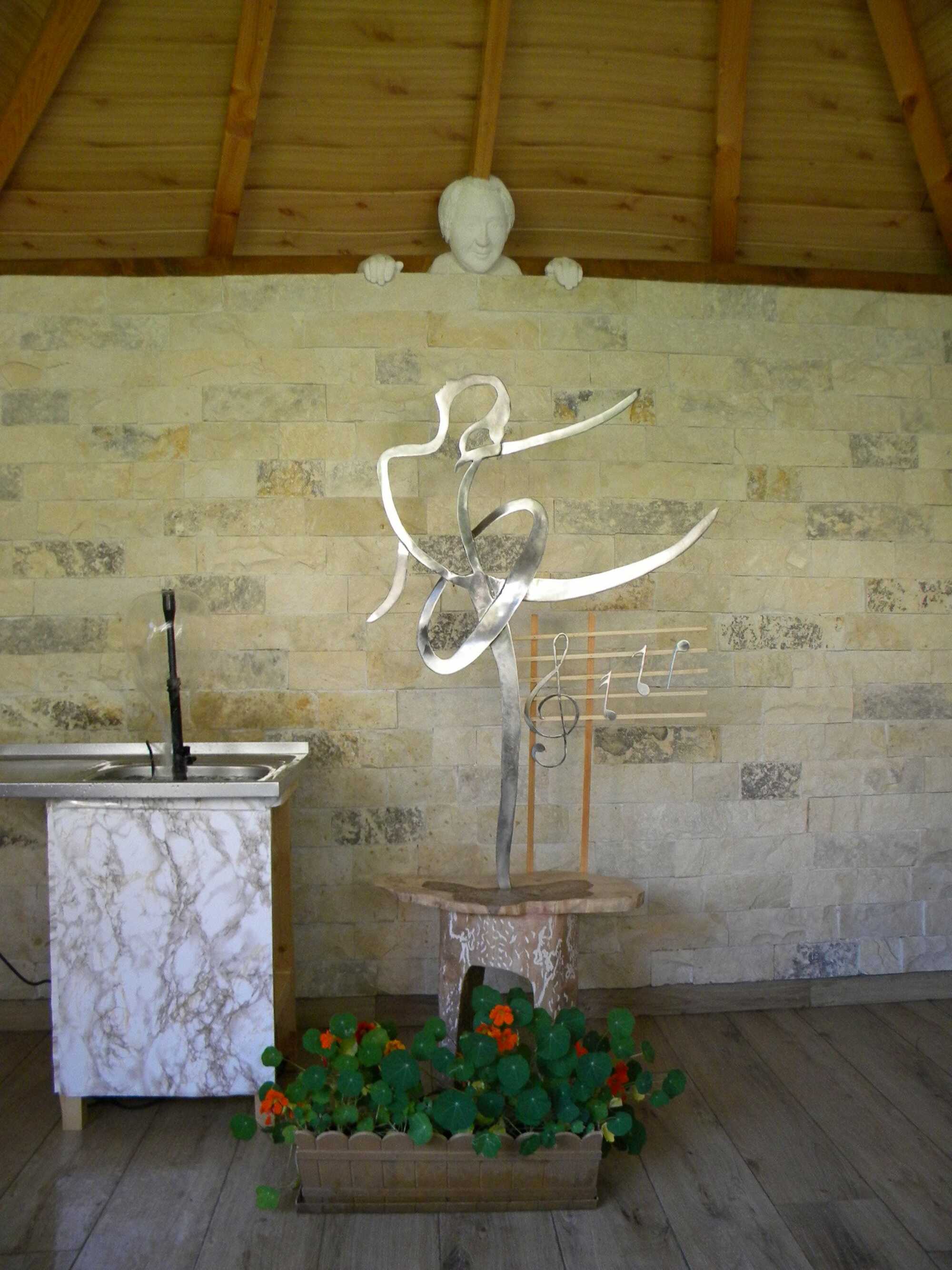 Self-portrait with ballerina in the garden pavilion. Inox, stone, wood.