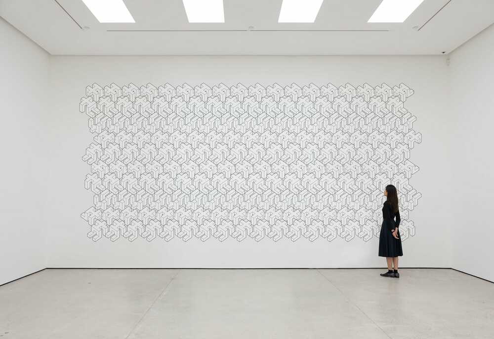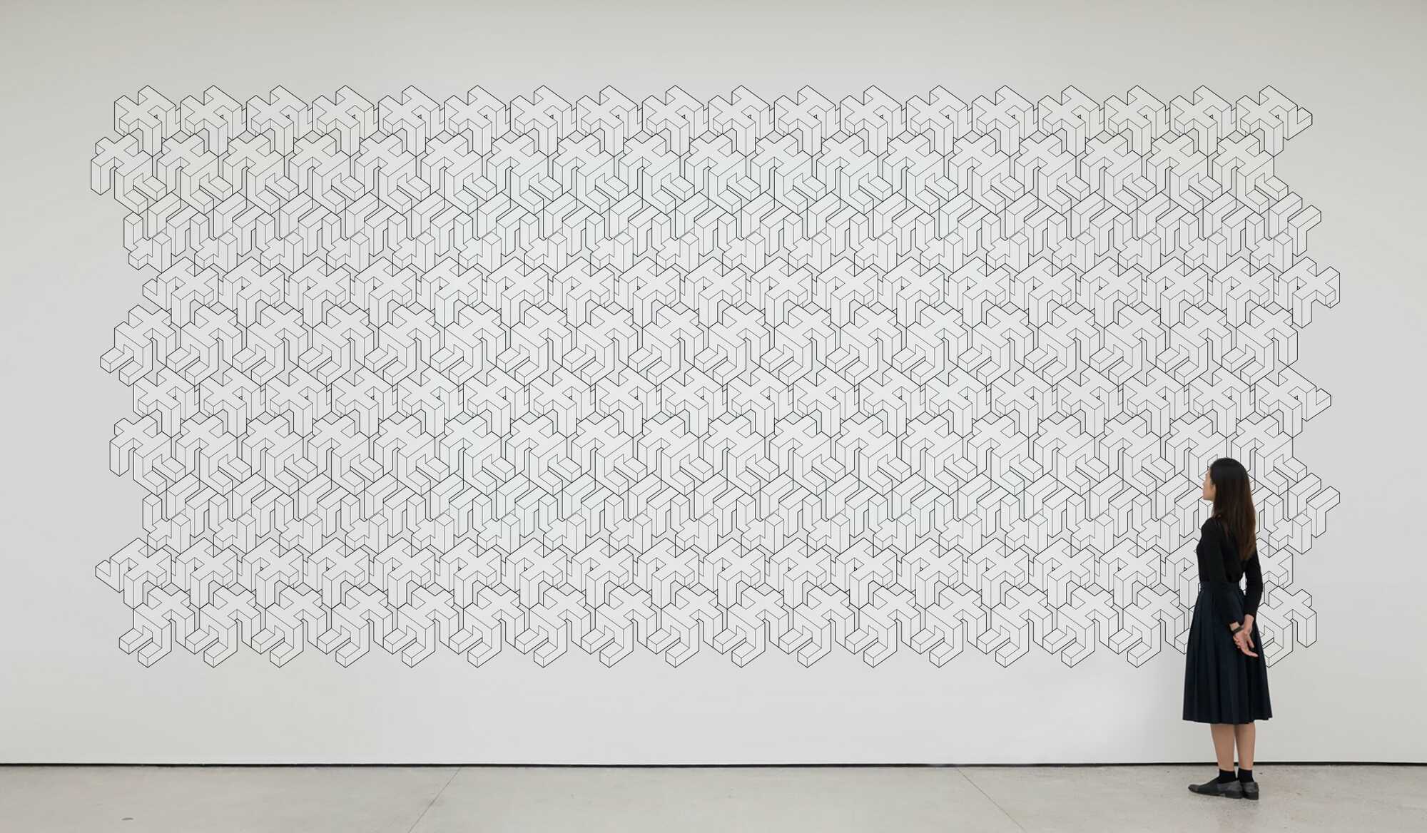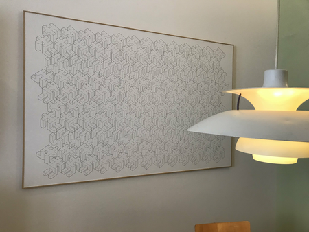 The graphic composition depicts a bird's eye view of a multitude of shapes that intersect as in a plot of buildings.
