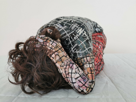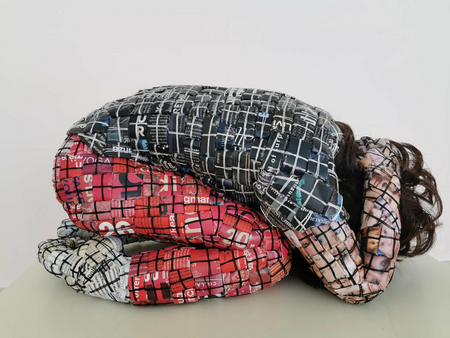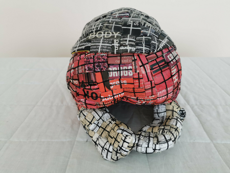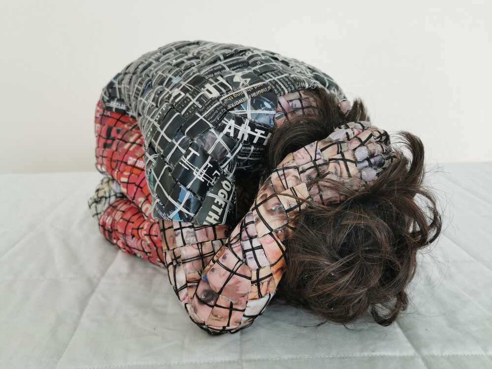 The surface of the sculptures is crucial to the meaning of the artwork: the outer layer is constructed as a mosaic of paper tiles. The paper parcels are tied together with thread.