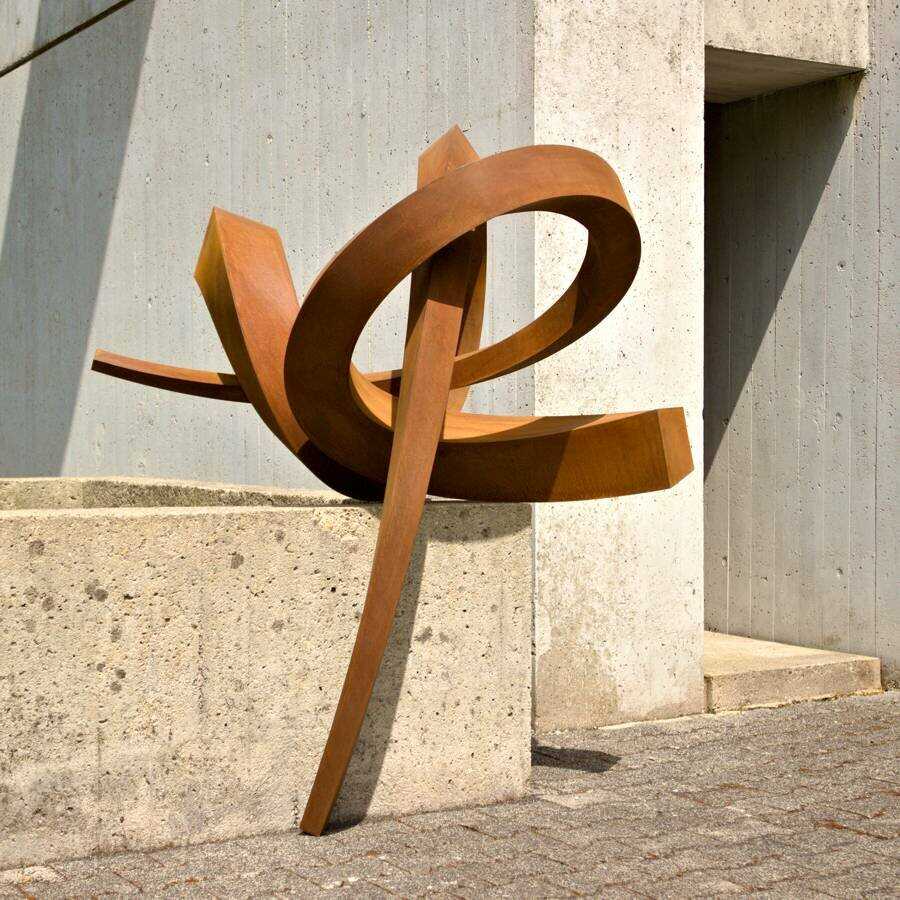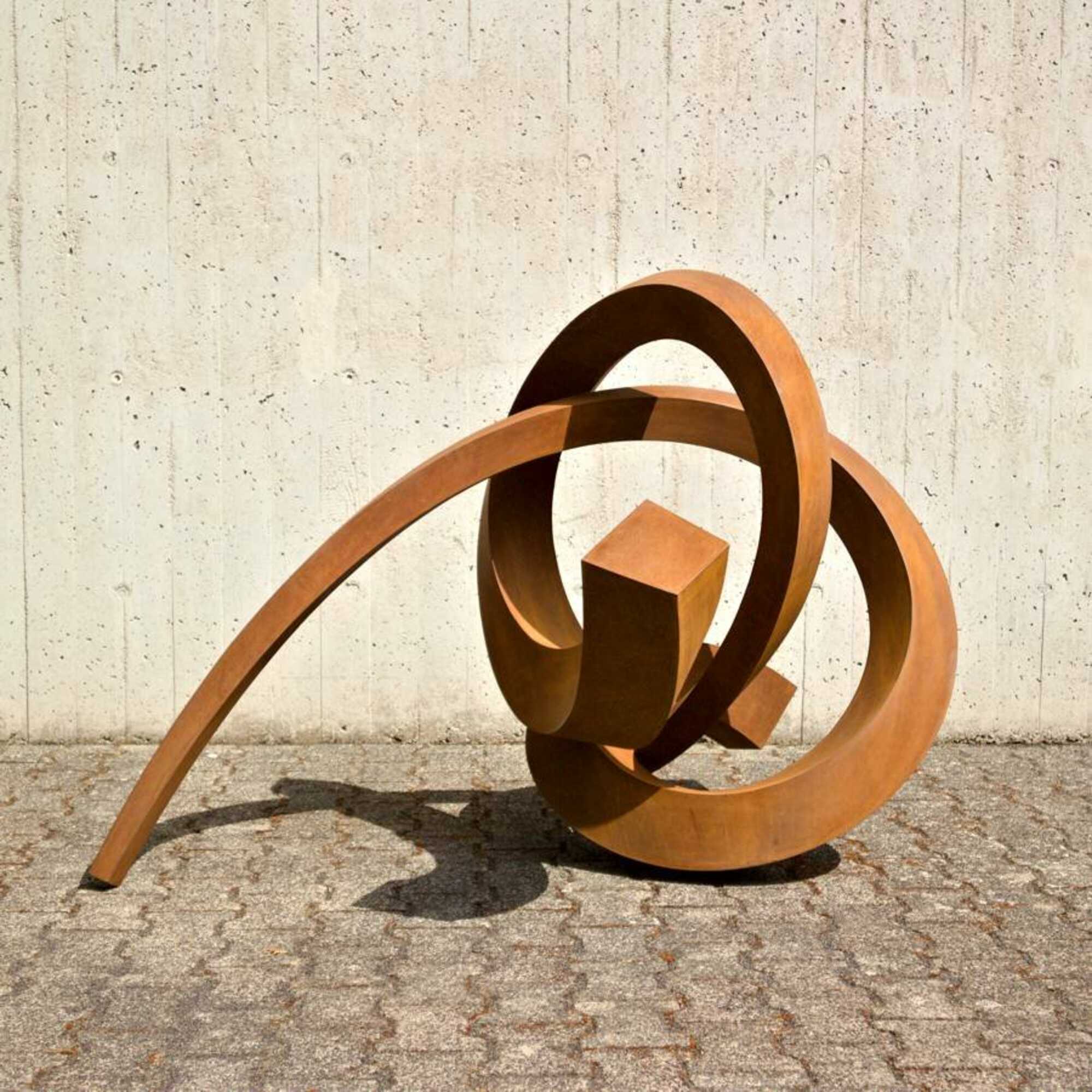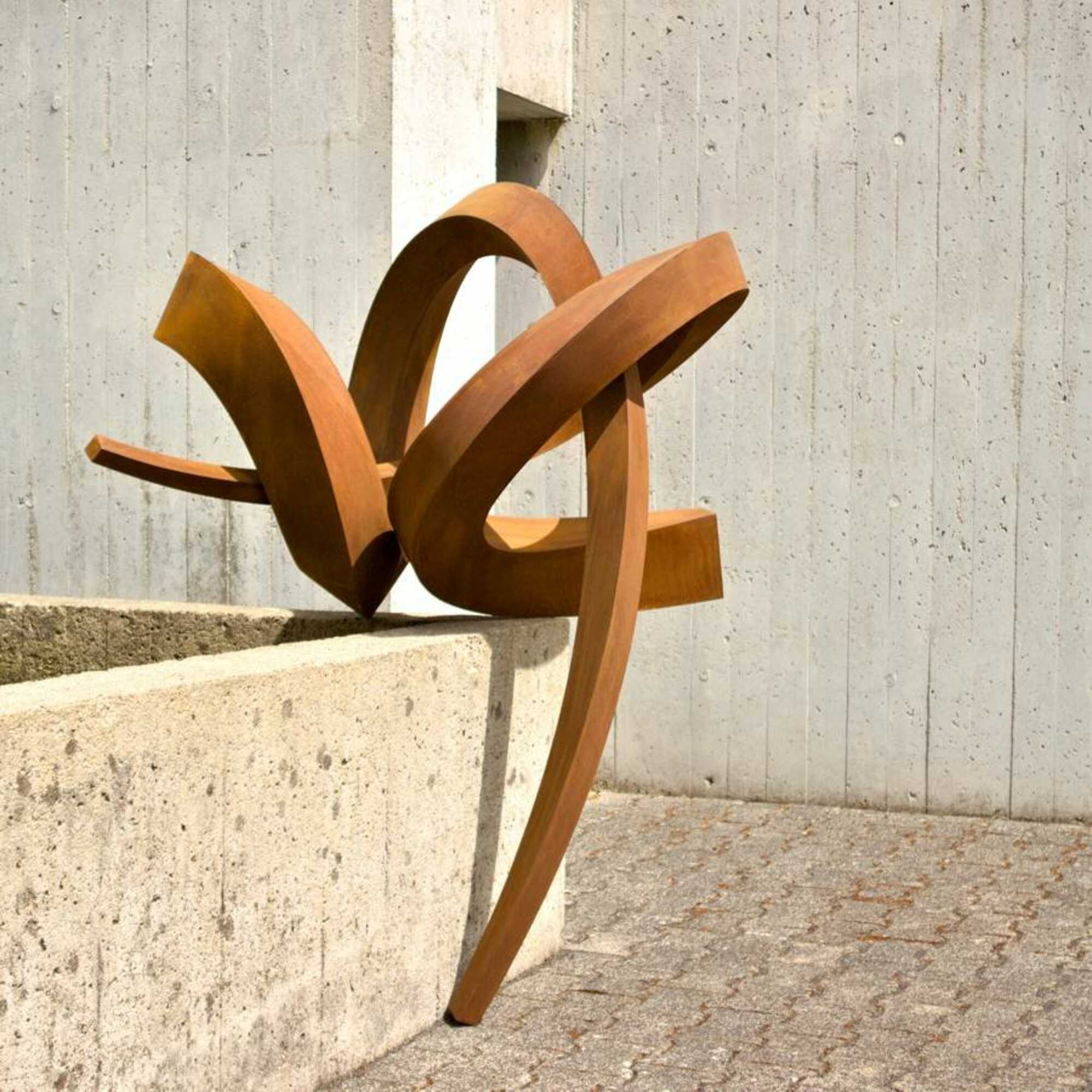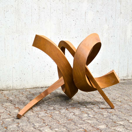 Die keilförmigen, zu beiden Enden sich vergrößernden Querschnitte der ineinander verschlungenen Skulptur treten durch ihre Formgebung in einen Dialog. Als sockellose Skulptur ergeben sich vielfältigen Liege- oder Hängepositionen. Sehr edel wirkt die oxidierte Oberfläche der im Innen- als auch im Außenbereich positionierbaren Skulptur.