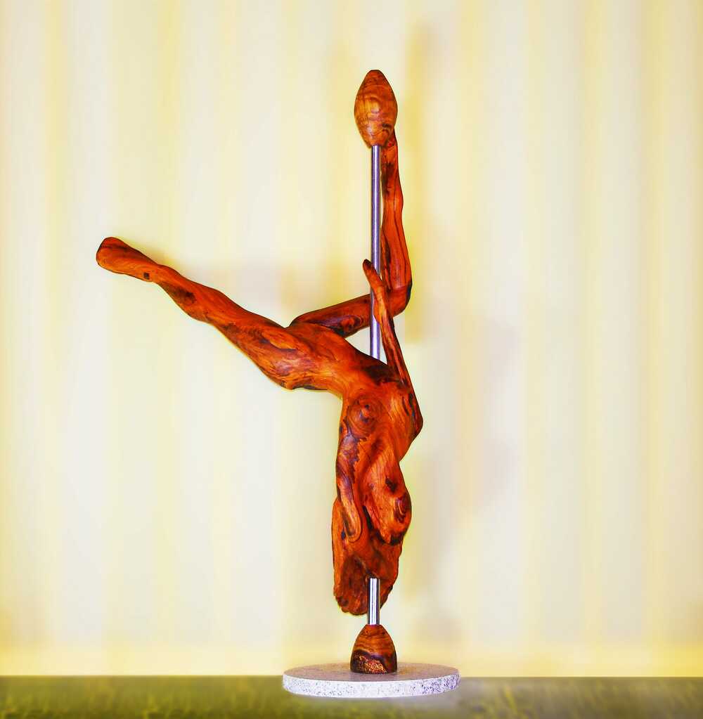 Tanzend am Pole entstand aus Marillenholz, Derr Stab selbst wird durch gedrechseltes Marillenholz vom selben Baum begrenzt. Standfuß aus polierter Granitplatte 30cm