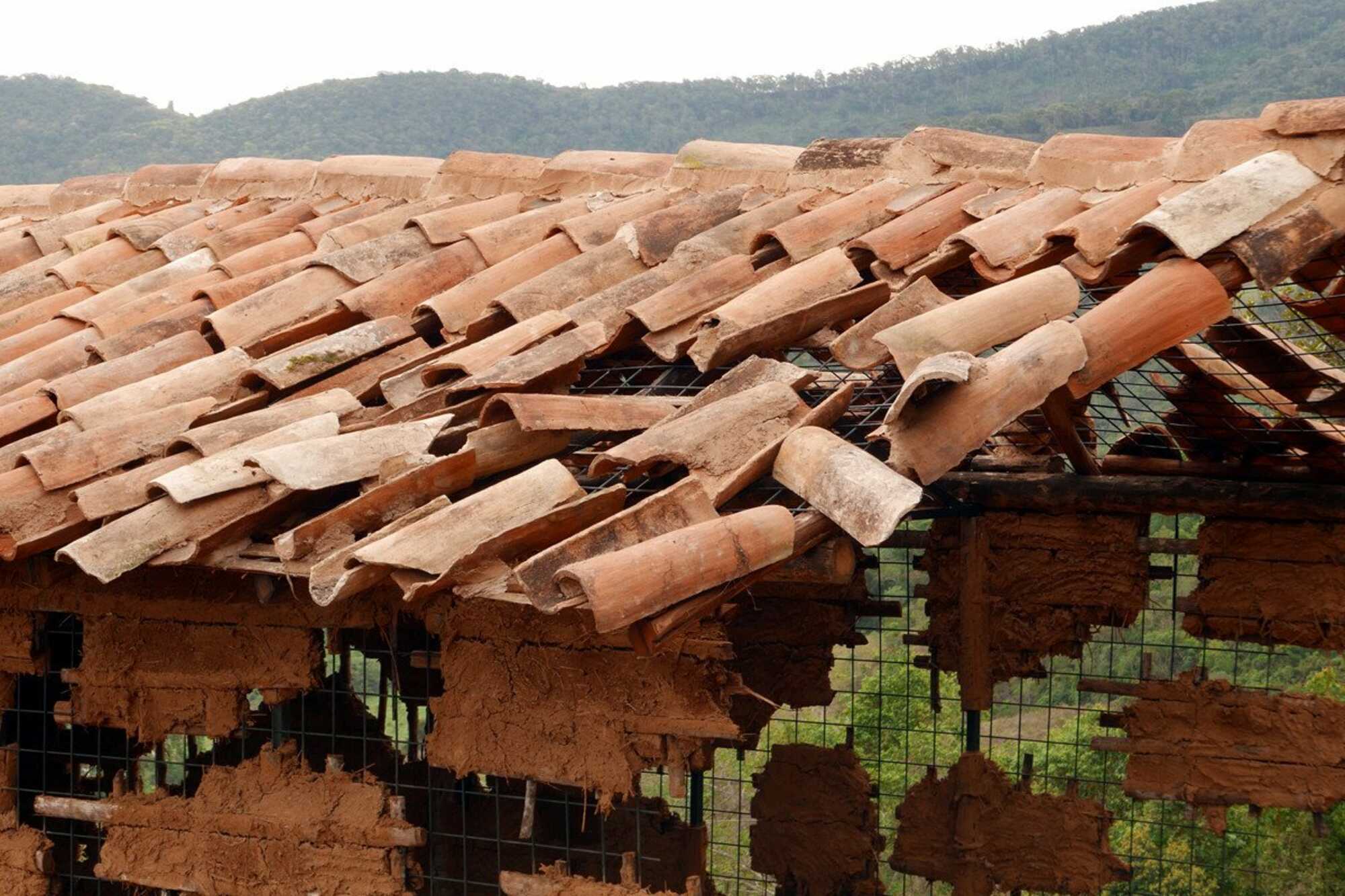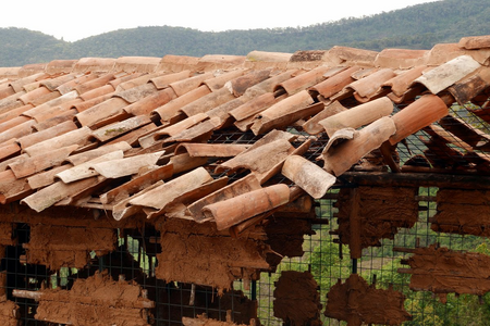 wood, clay soil, straw, cow dung, cement, metal grid, rooftiles