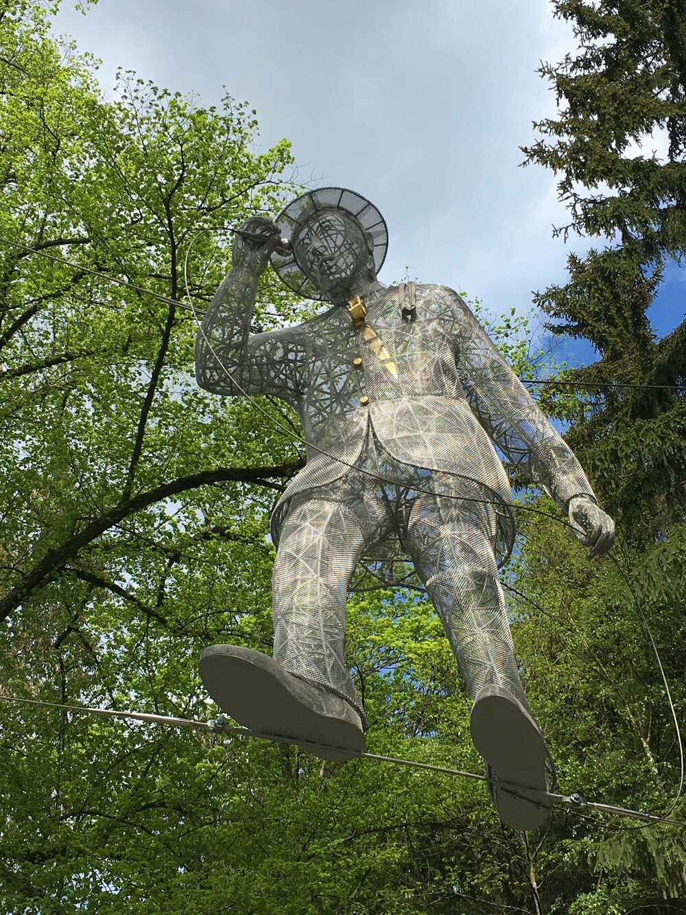Filigree stainless steel mech sculpture, one of three to discover above the sculpture path to the Open Air Theater in Bad Elster on cabels. Illuminated at night, they set the mood for the cultural evening on stage.