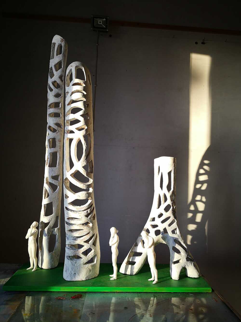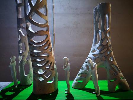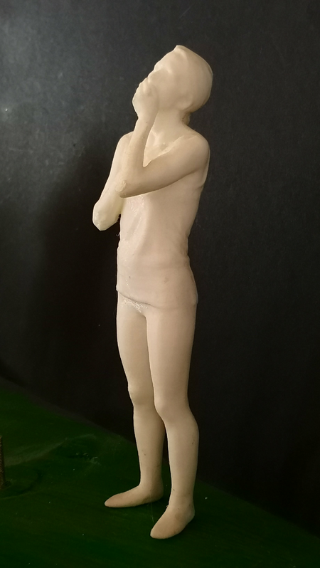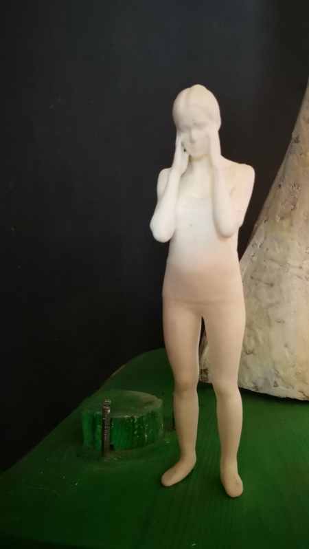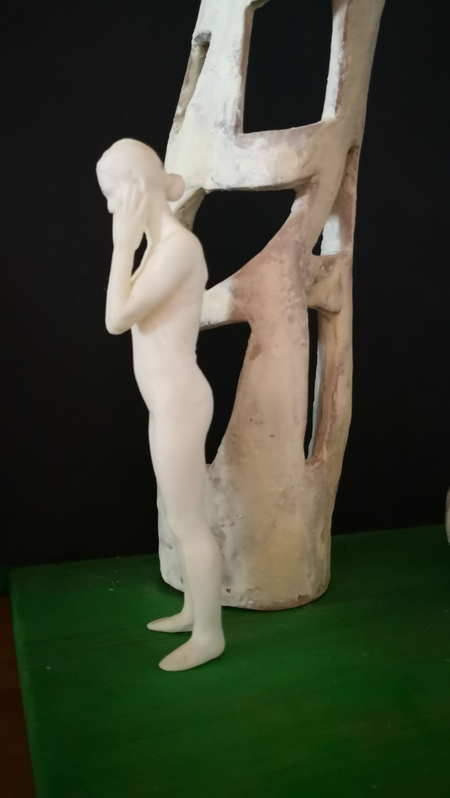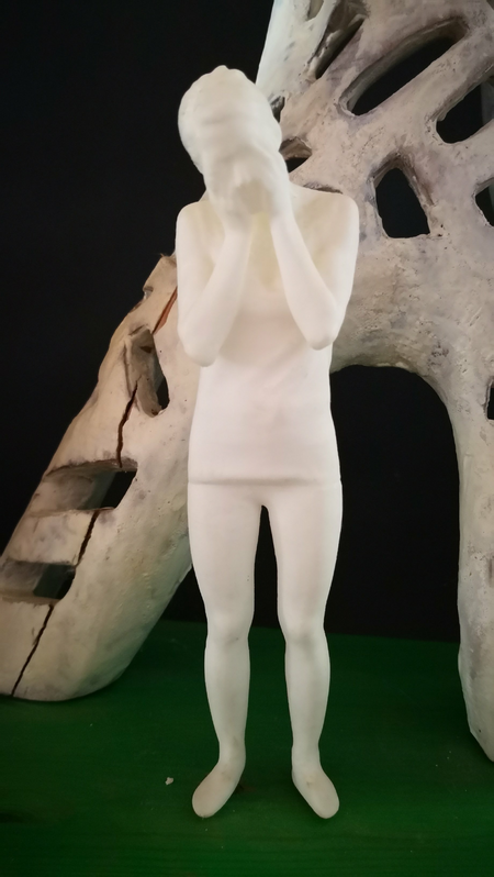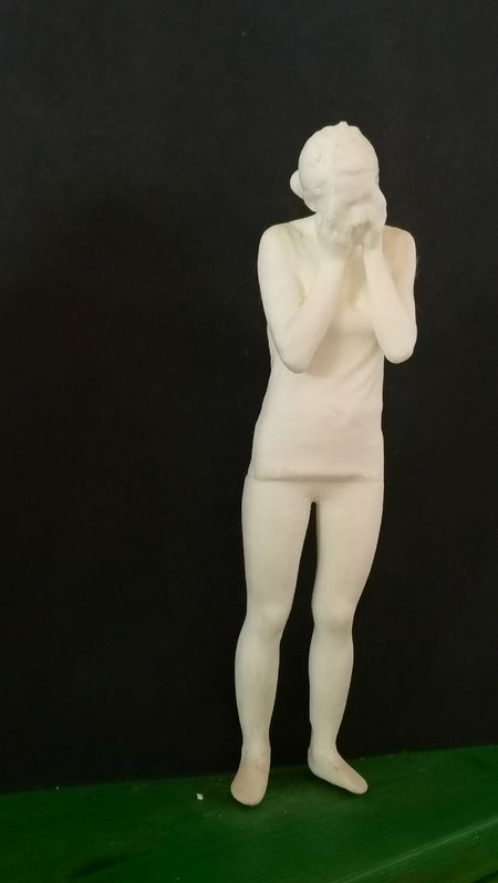 Was sie hier sehen ist das Modell für gegebenfalls öffentliches Werk. Es ist eine aus olivenholz gemeisselte Skulptur zusammen mit 3D scan und 3D print von einer Frau die sich die Ohren, den Mund und die Augen zuhält. das bedeutet: