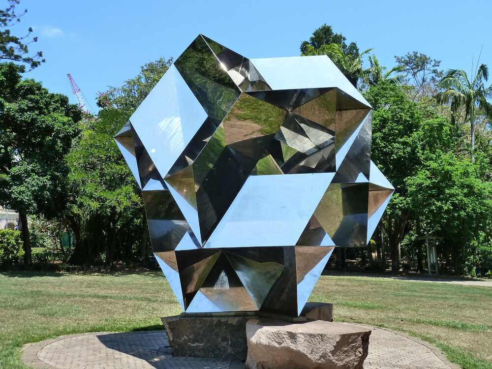 one of two sculptures created for the World Expo 1988, in Brisbane, Australia. named for the Pole Star. entirely mirror polished stainless steel, 5 meters dia. now reinstalled in the Brisbane Botanical Gardens.