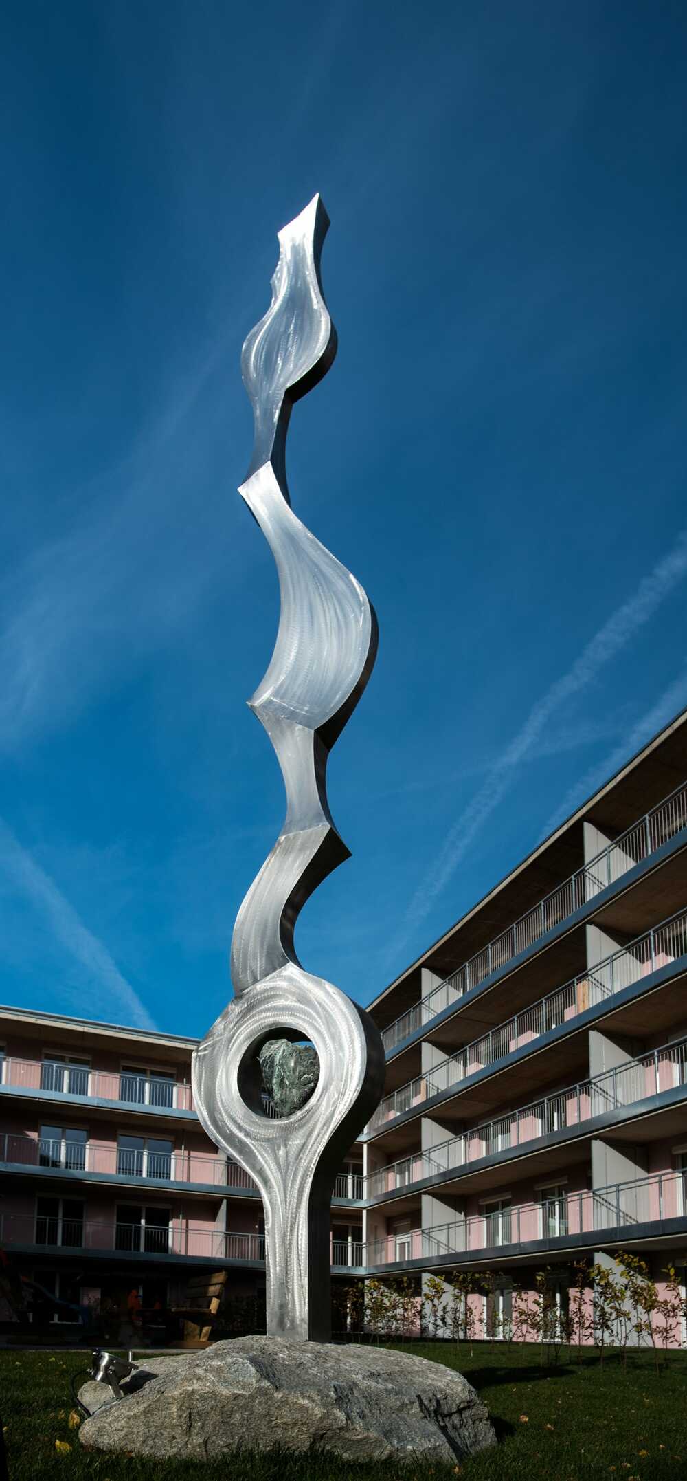 Edelstahl, Bachsteinfindling, Steinsockel aus Granit, Höhe 5m