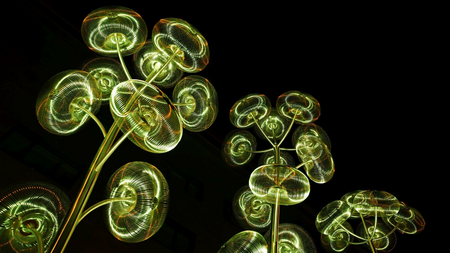 When the sun sets, the dynamic illumination system (RGB LED lamps in light boxes installed in ground + the controller) lets the sculpture undergo a complete metamorphosis and shows its true colors. It’s a great feature in dynamic public places, where lots of people walk.