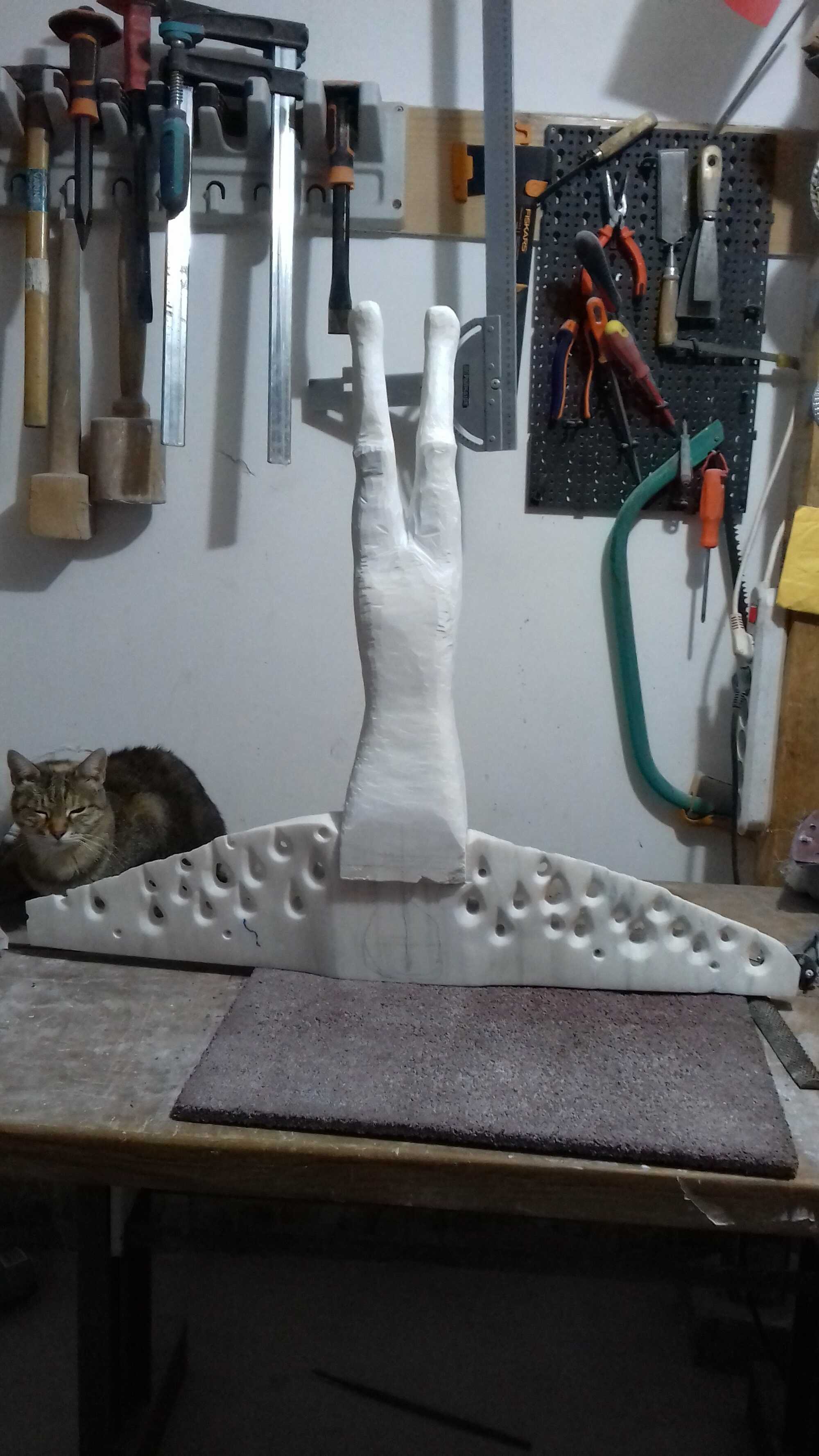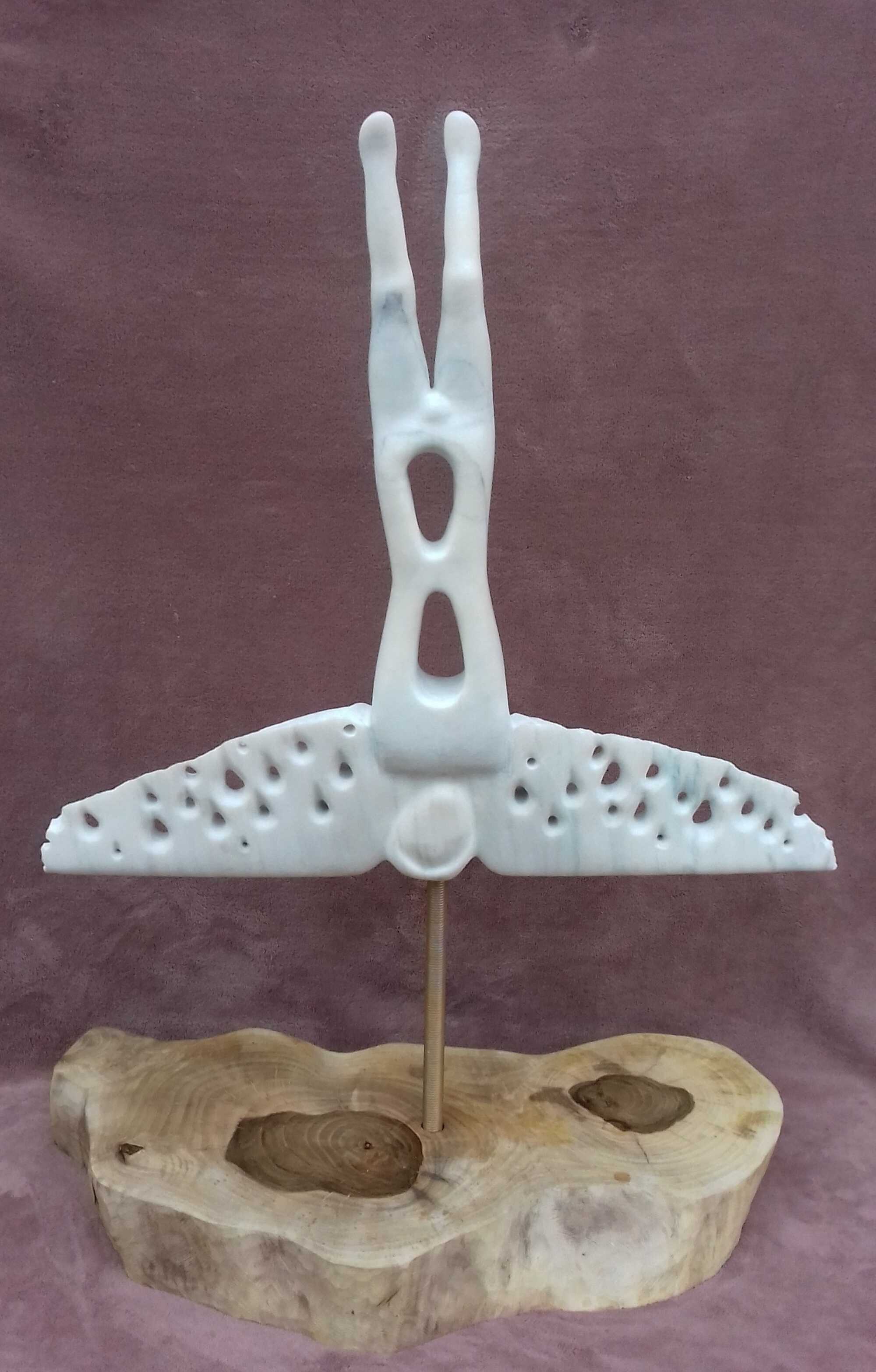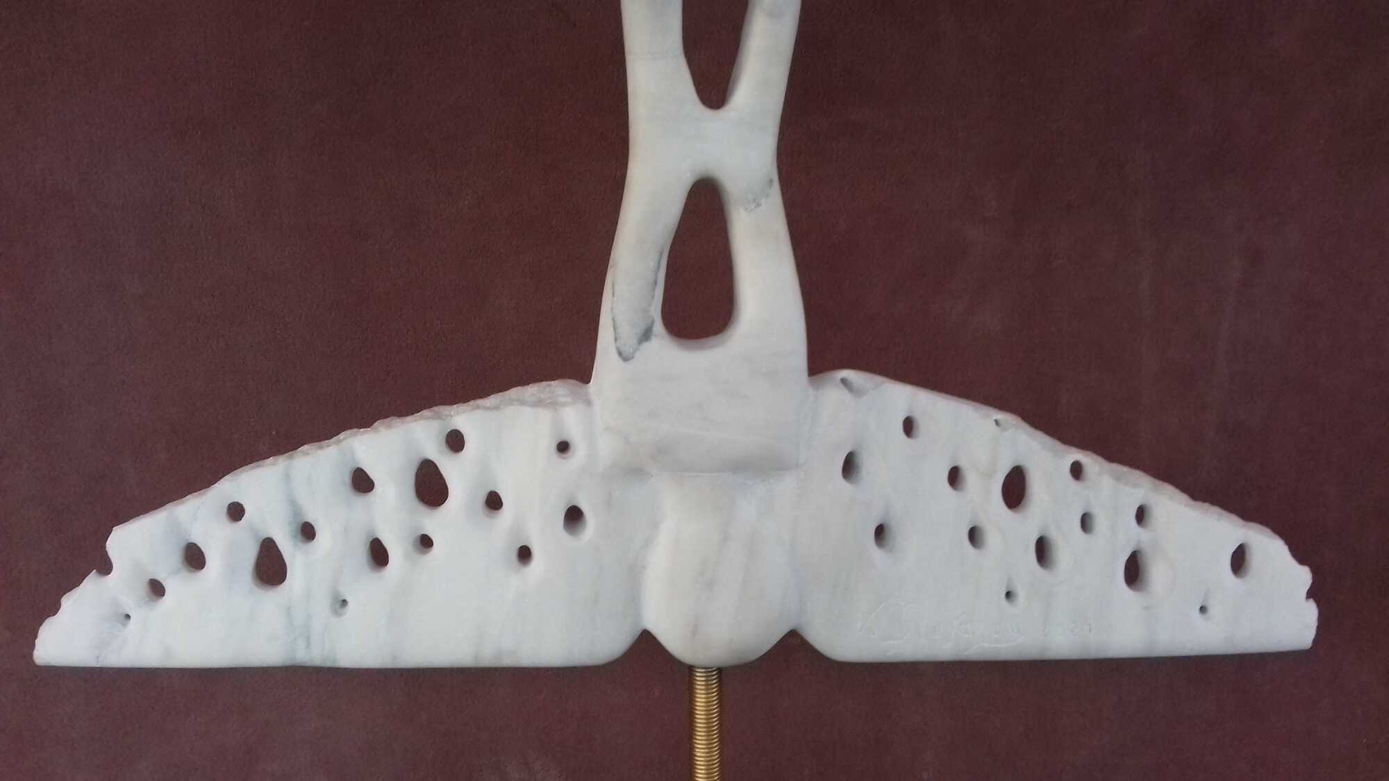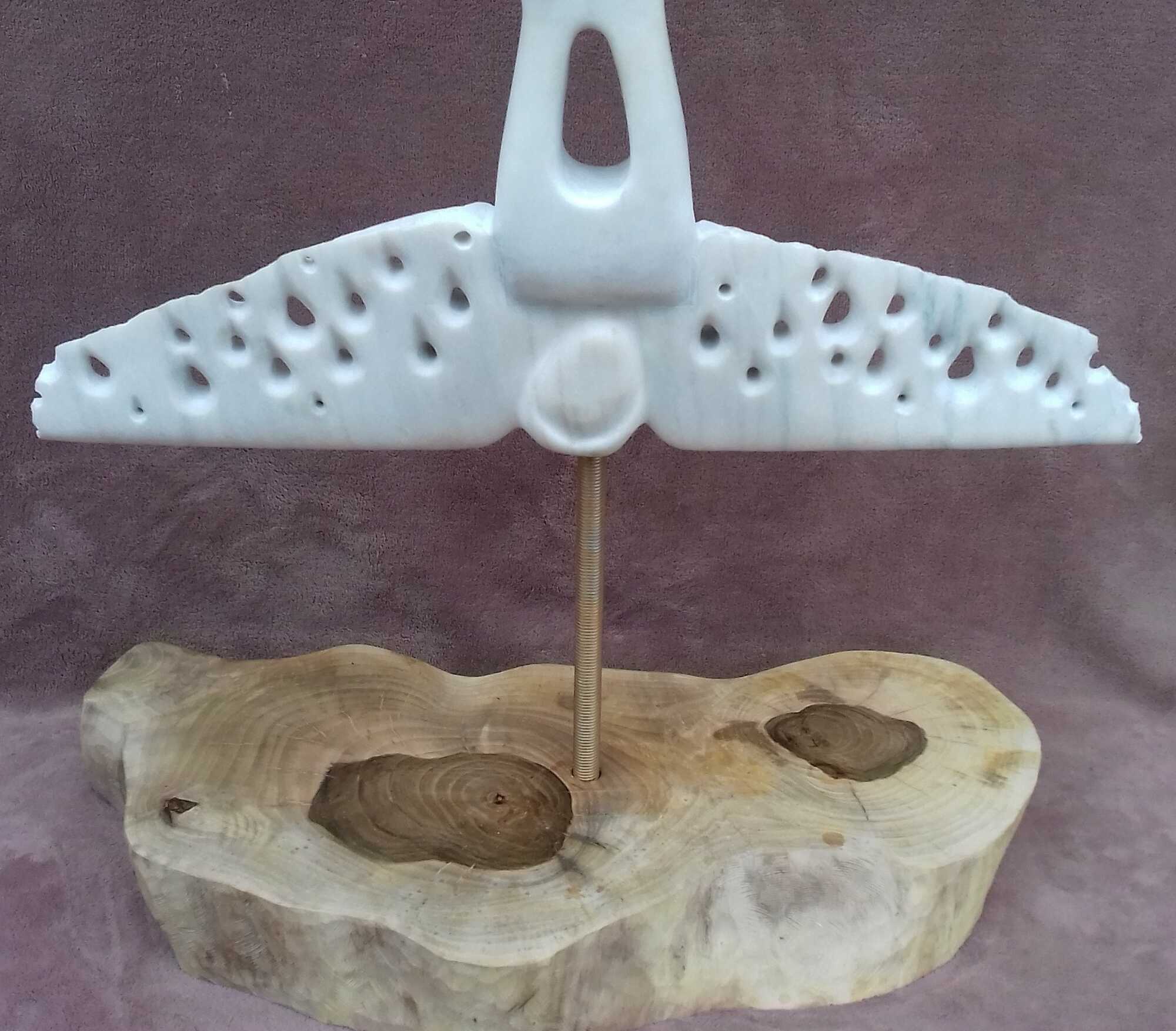 Artwork Title: “Icarus - the dream of freedom”, carved © 2021, Artwork dimensions : Height/Width/Depth : 101 x 74 x 37 cm, weight 28 kg. Marble, threaded iron and wood.