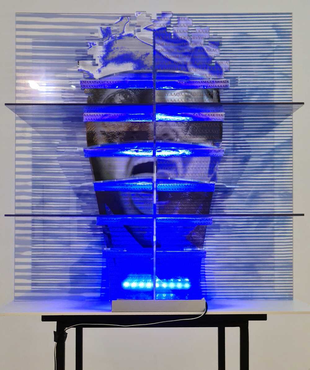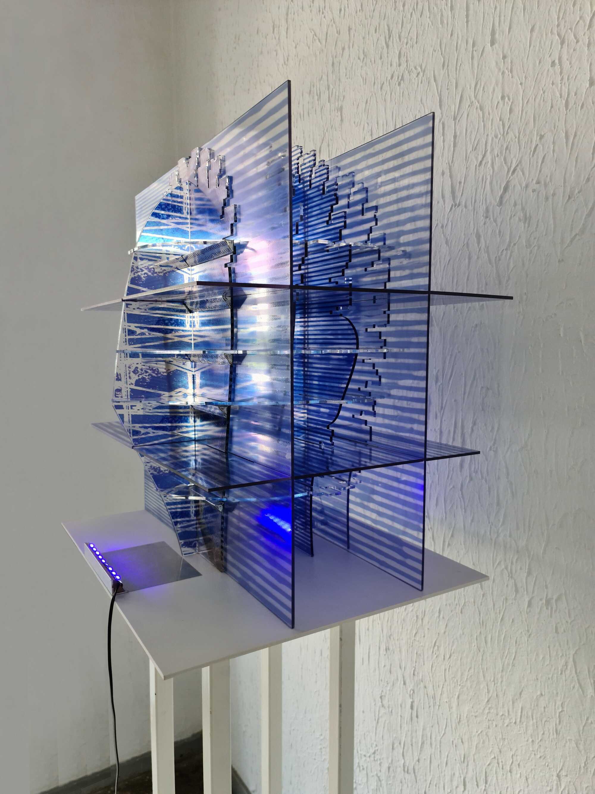 ("Perseus Kills Medusa", 1903). Although the myth of Medusa has often been interpreted in feminist contexts, another aspect of the ambiguous myth has been chosen for this work: the three Gorgons sisters were winged sea monsters with snakes instead of hair, and whoever looked them in the eye was petrified. The screaming Gorgon-Medusa expresses the effects of the blue screens, the state of freezing when immersed in the screen, and also the effort to free yourself from imprisonment on the screens.