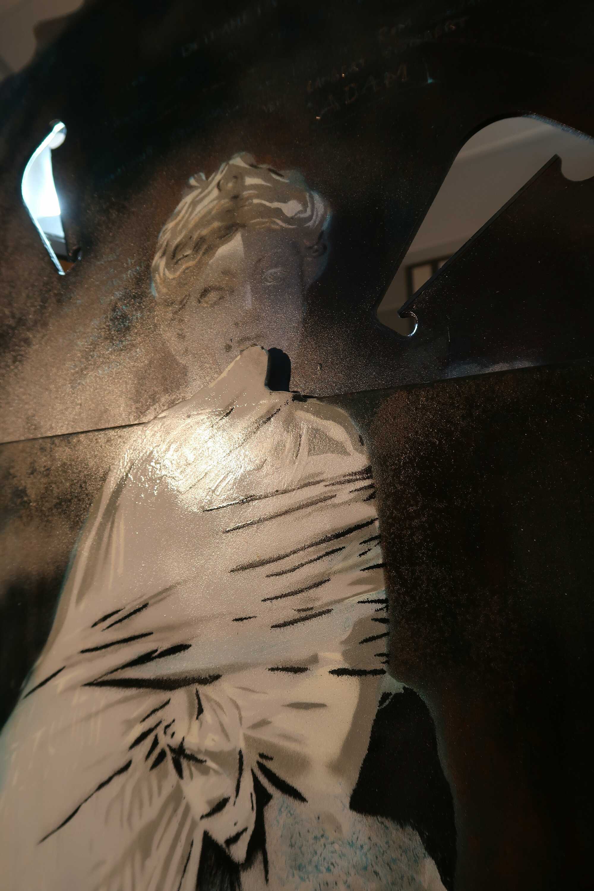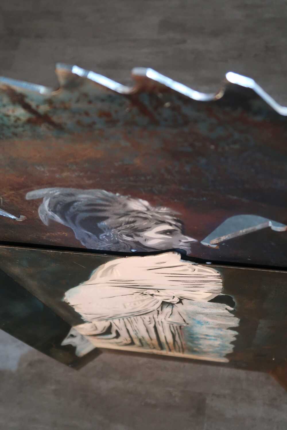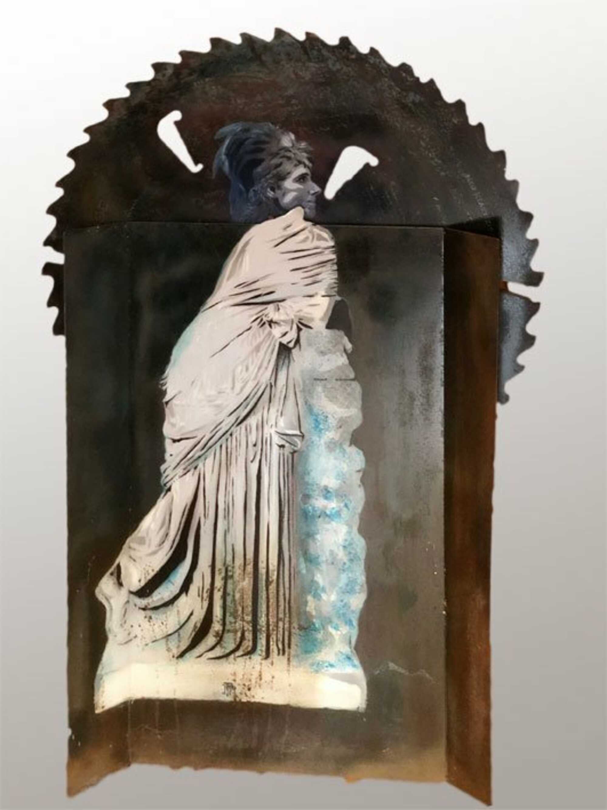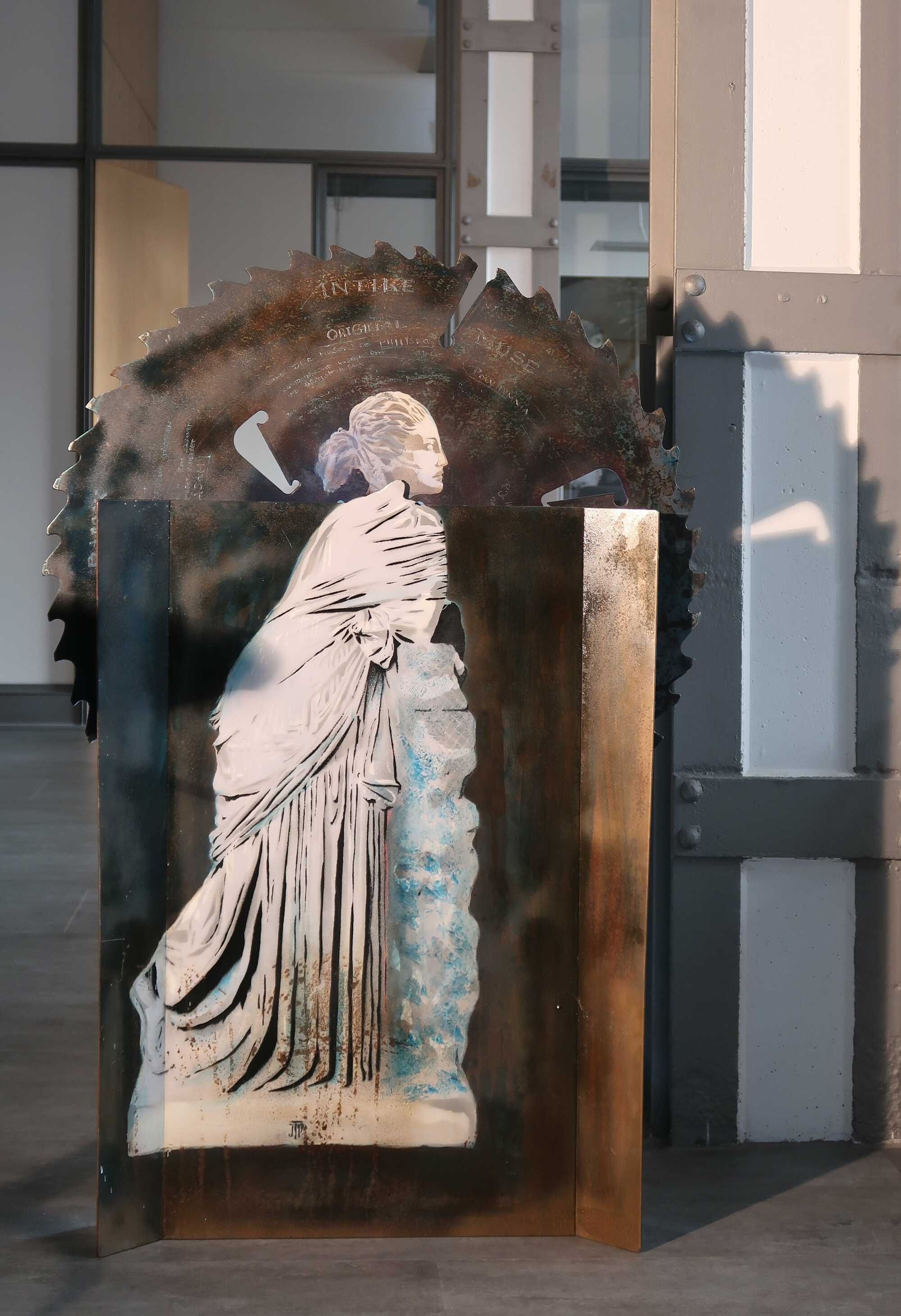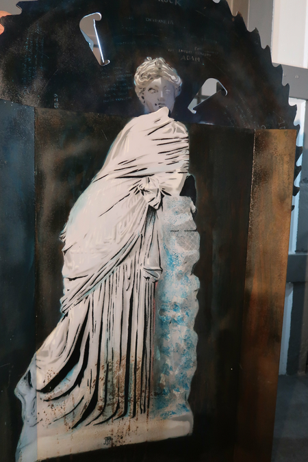 Upcycled sculpture with a movable saw blade on which 4 different variants of the head can be seen: the baroque version, classicism, the antique original and P J Harvey, the artist's muse