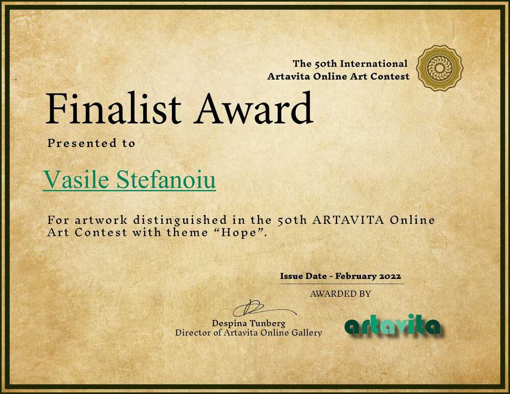 Awarded Artist Certificate finalists in the latest Artavita contest with the theme “Hope”. A total of 609 artists participated with 1682 works and with so many tremendous creations.