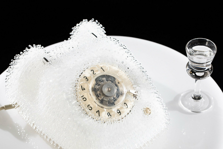borosilicate glass, uberfang glass, vintage rocking chair and telephone, table cloth, drinking glass, silicone