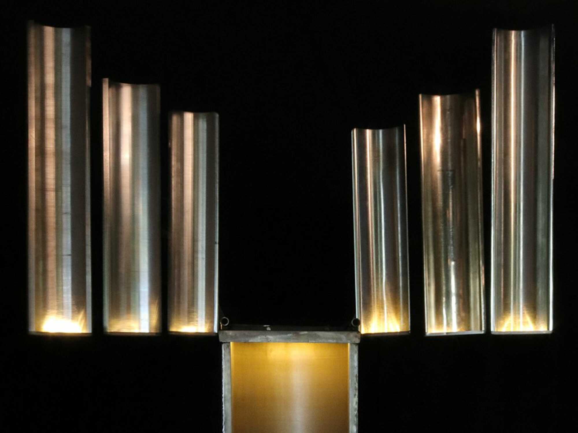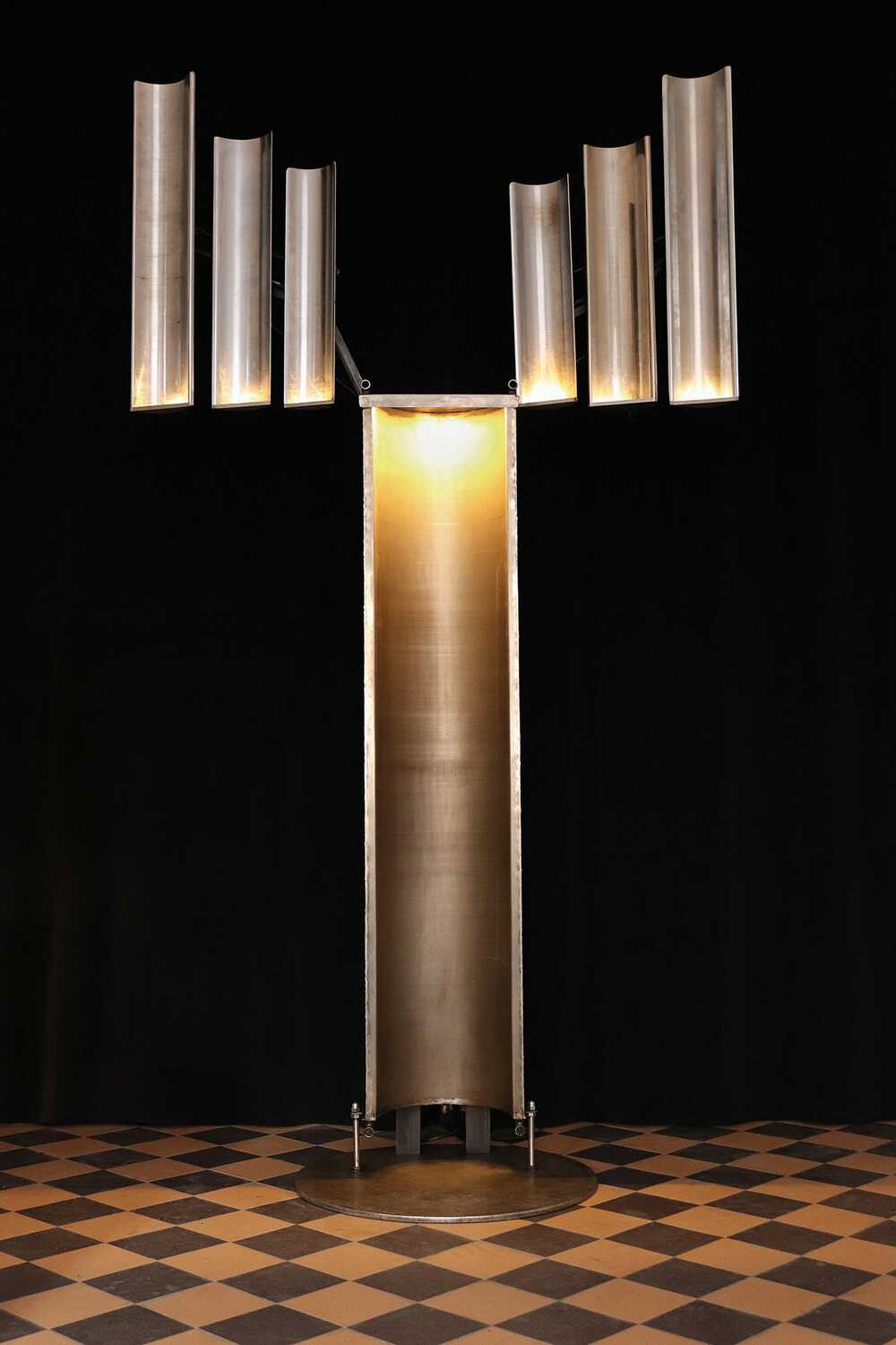 Und so kam der Bügelpalast zu seinem Namen: Die Mulde einer Heißmangel ragt imposant senkrecht in die Höhe – an deren Oberkante wedeln rechts und links jeweils drei Bügelmulden aus kleineren Walzenbügelmaschinen fächerartig bedächtig hin und her. Wäschereitechnik trifft auf Formensprache – Walzbügler mutieren zu Palastsäulen.