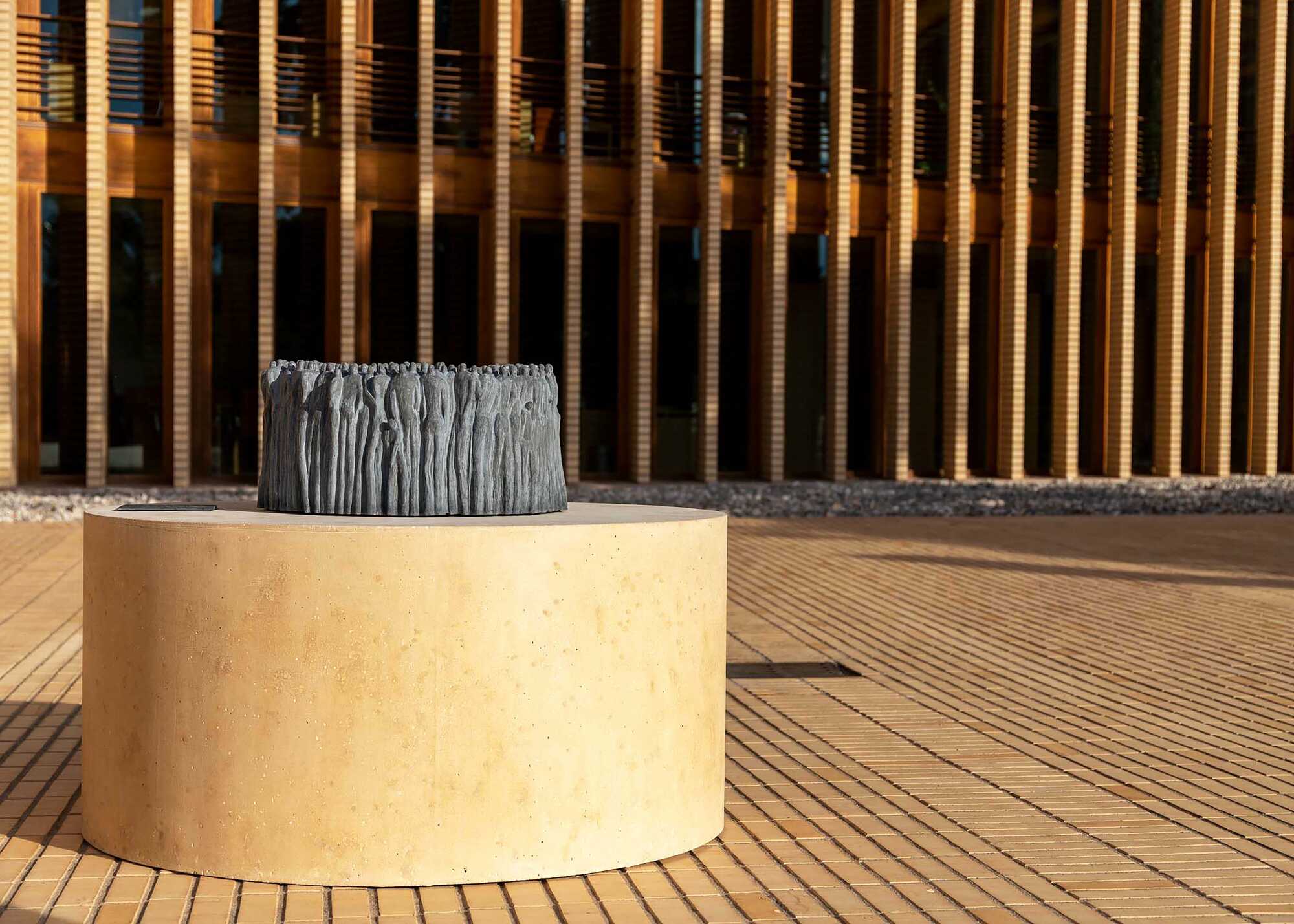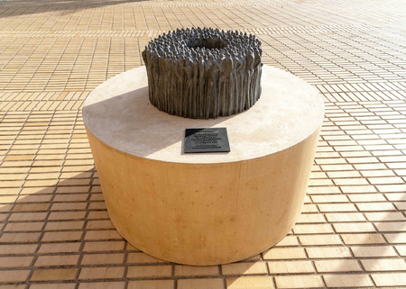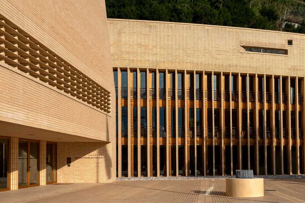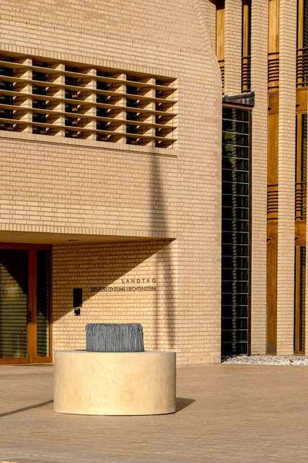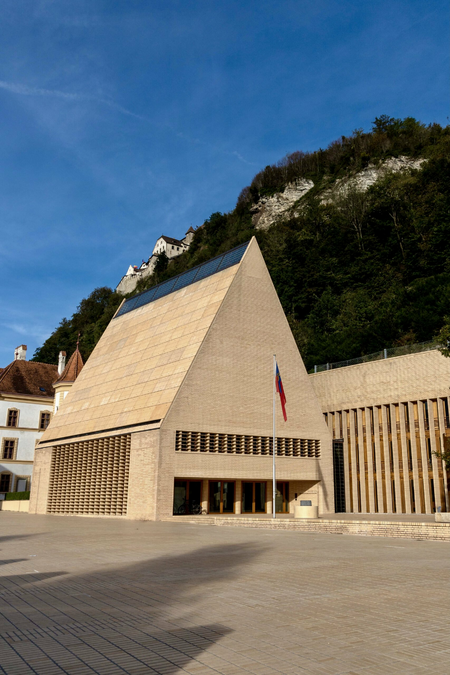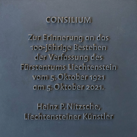 Monument vor dem Liechtensteinischen Parlament. Zur Erinnerung an das 100-jährige Bestehen der Verfassung des Fürstentums Liechtenstein vom 05. Oktober 1921 am 05. Oktober 2021. Peter-Kaiser-Platz, Vaduz, Liechtenstein.