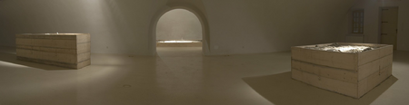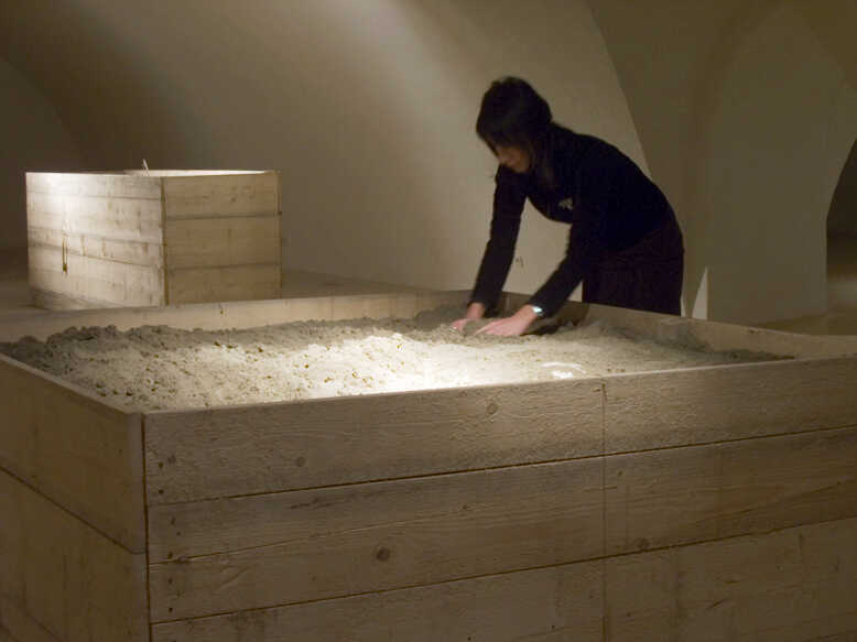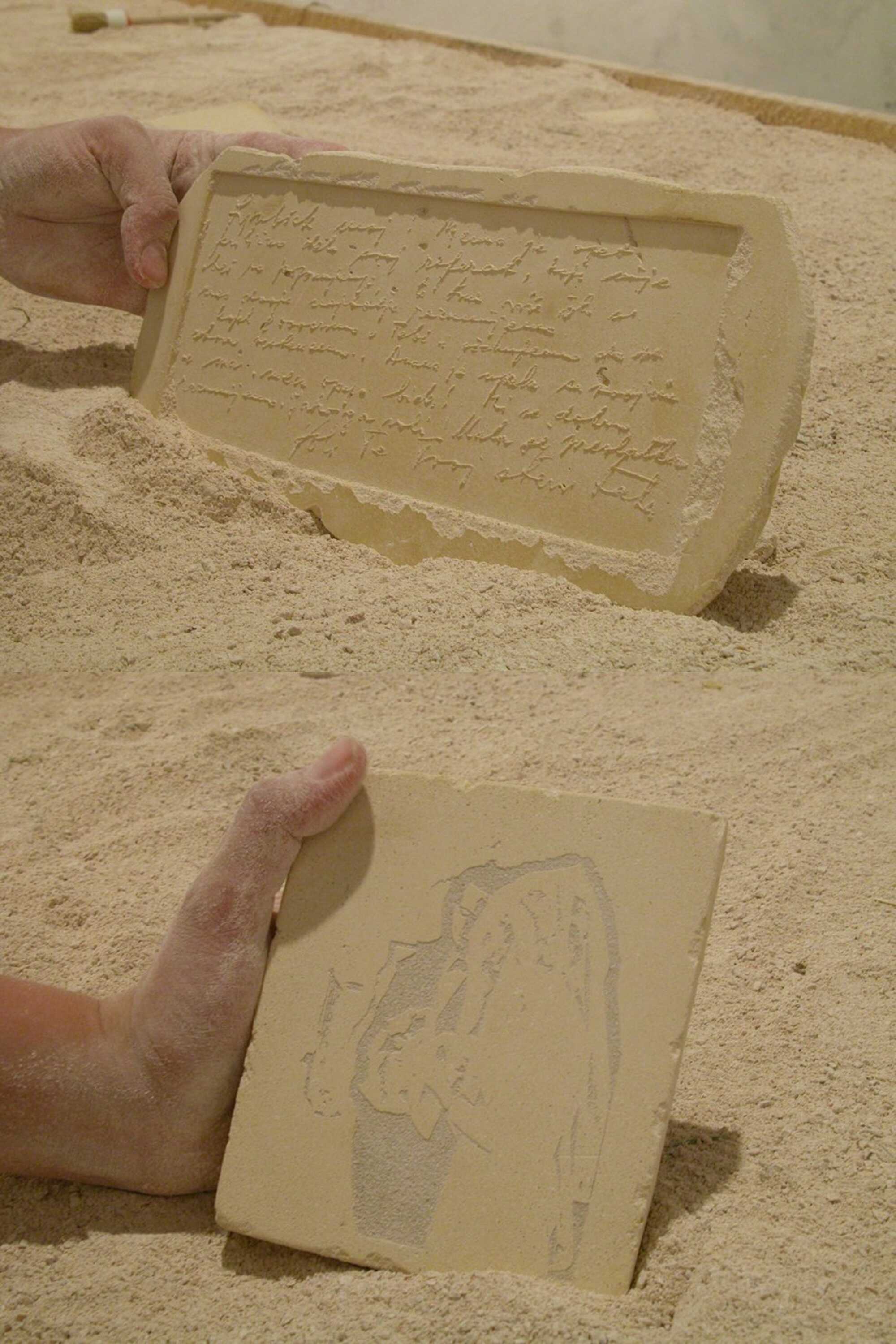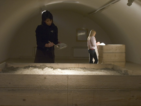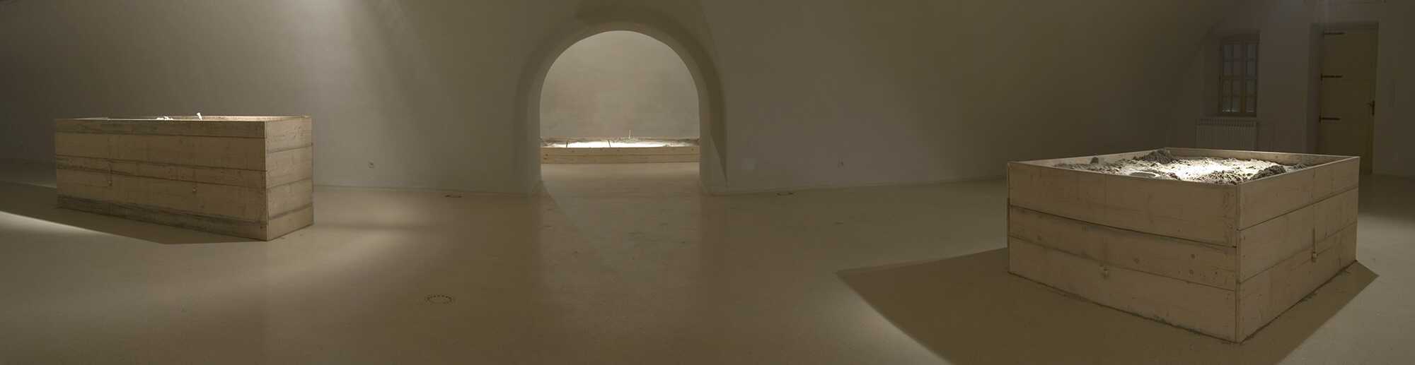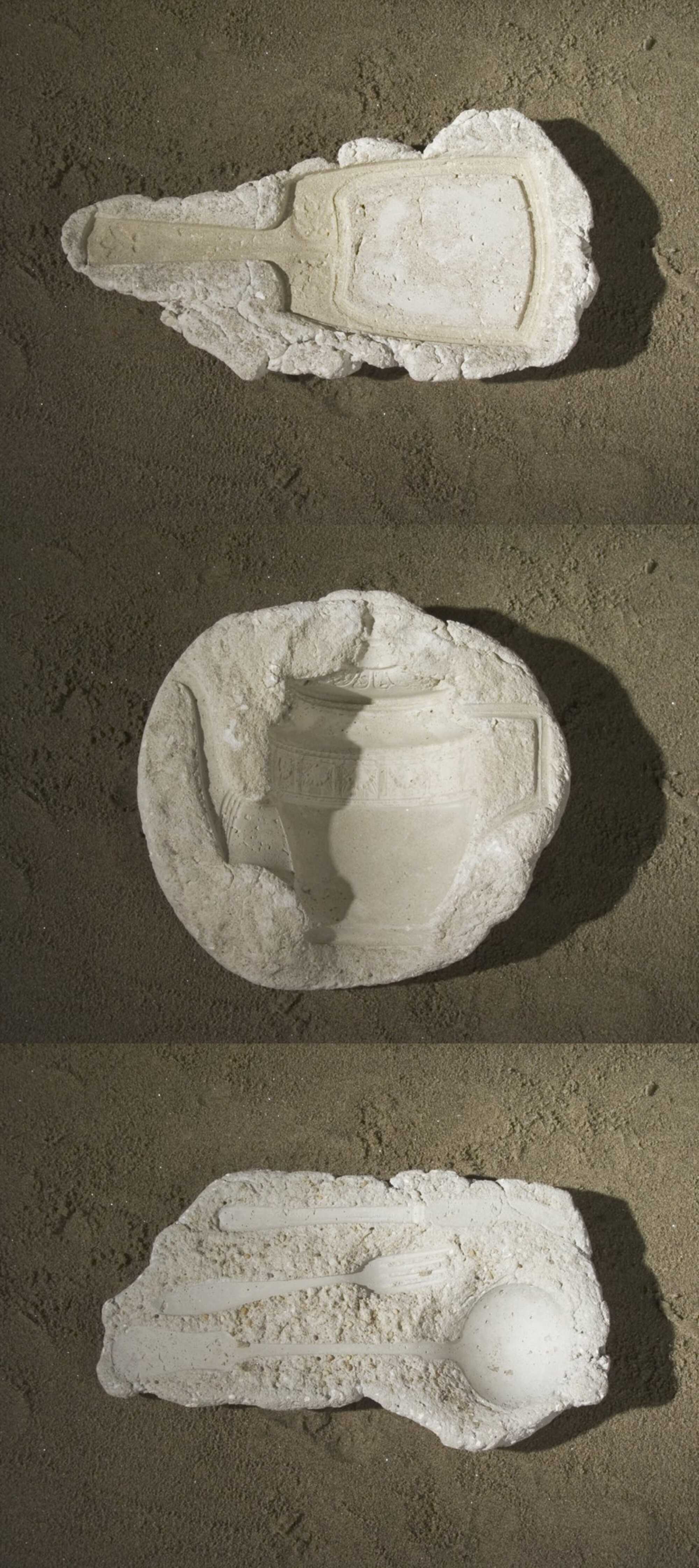 interactive sculptural installation by Marina Bauer, 3 sandboxes with cement casts of objects, photos and texts