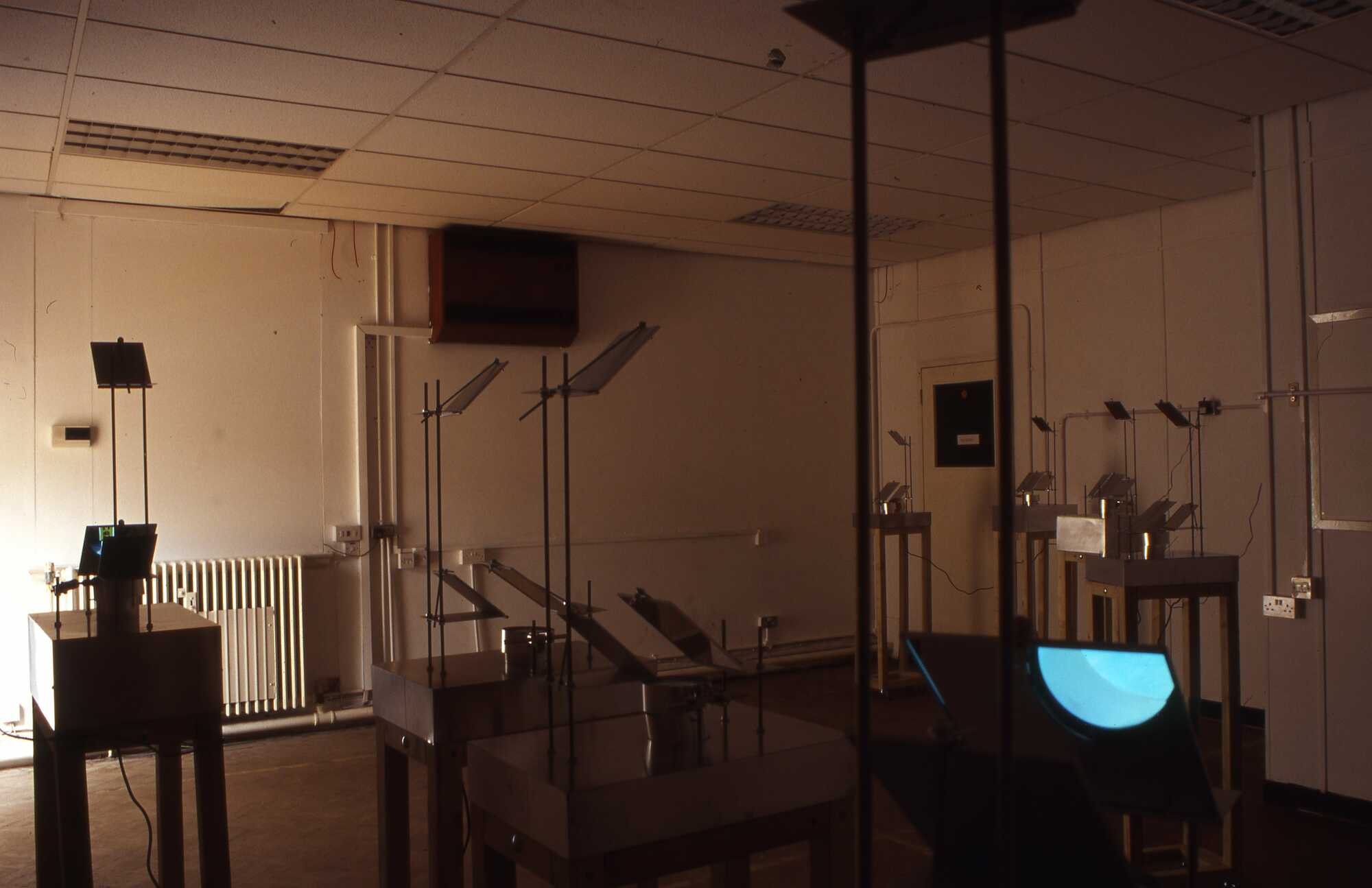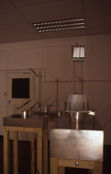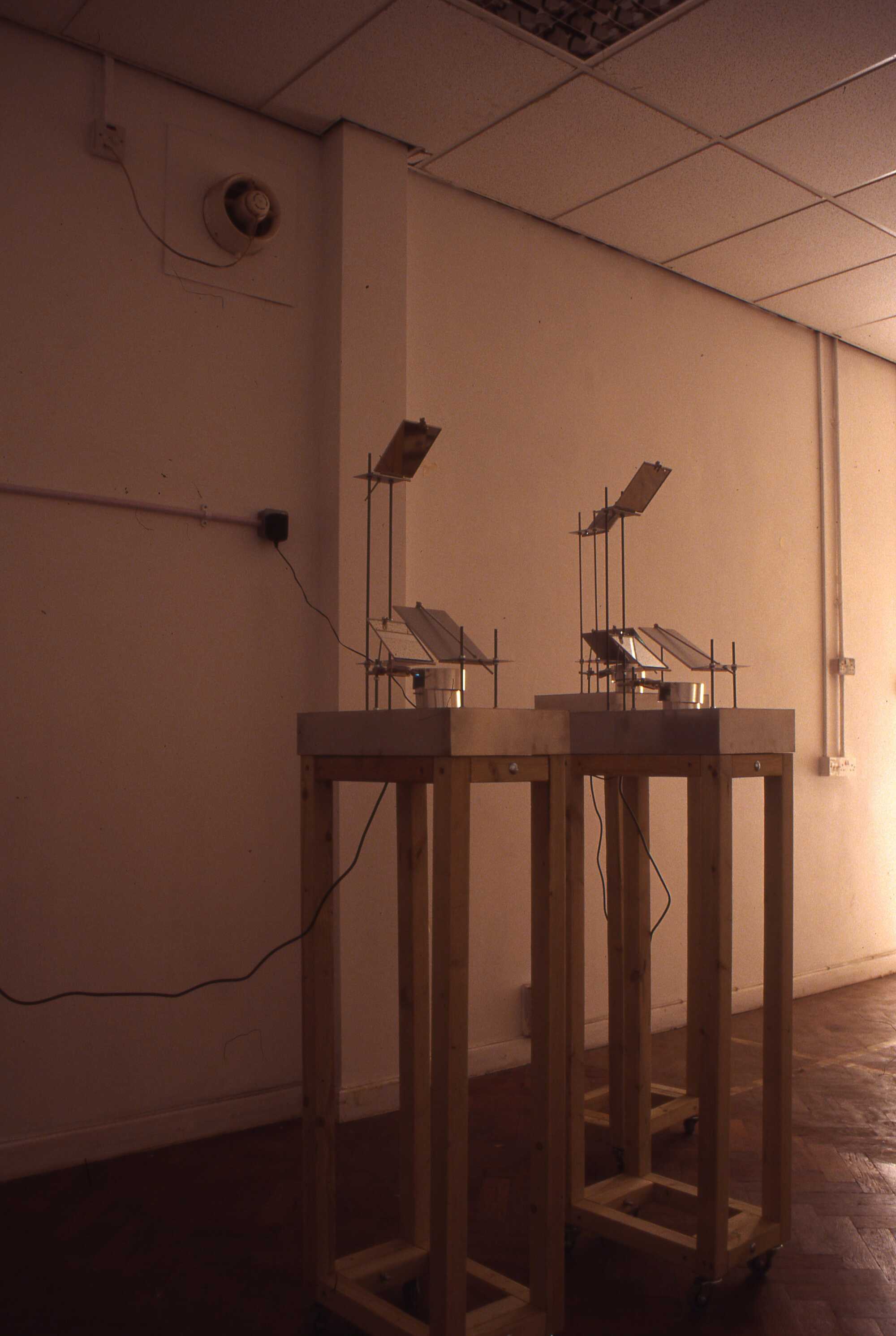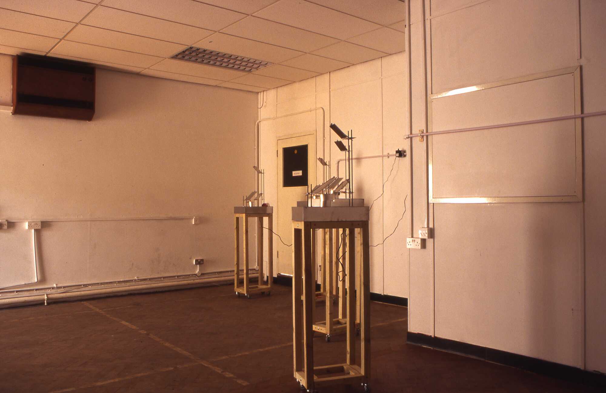 Eight sculptures, each having an internal video screen visible via a set of mirrors and a lens. The screens were connected in twos to a dvd player, and displayed a single channel video of imagery shot in Tokyo, and with an audio track of ambient sounds from Japan. The dvd players meant that the sounds moved in and out of phase. The electric conduit connecting the sculptures was also part of the work.