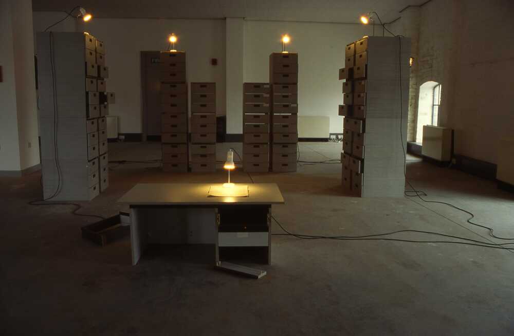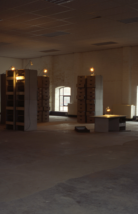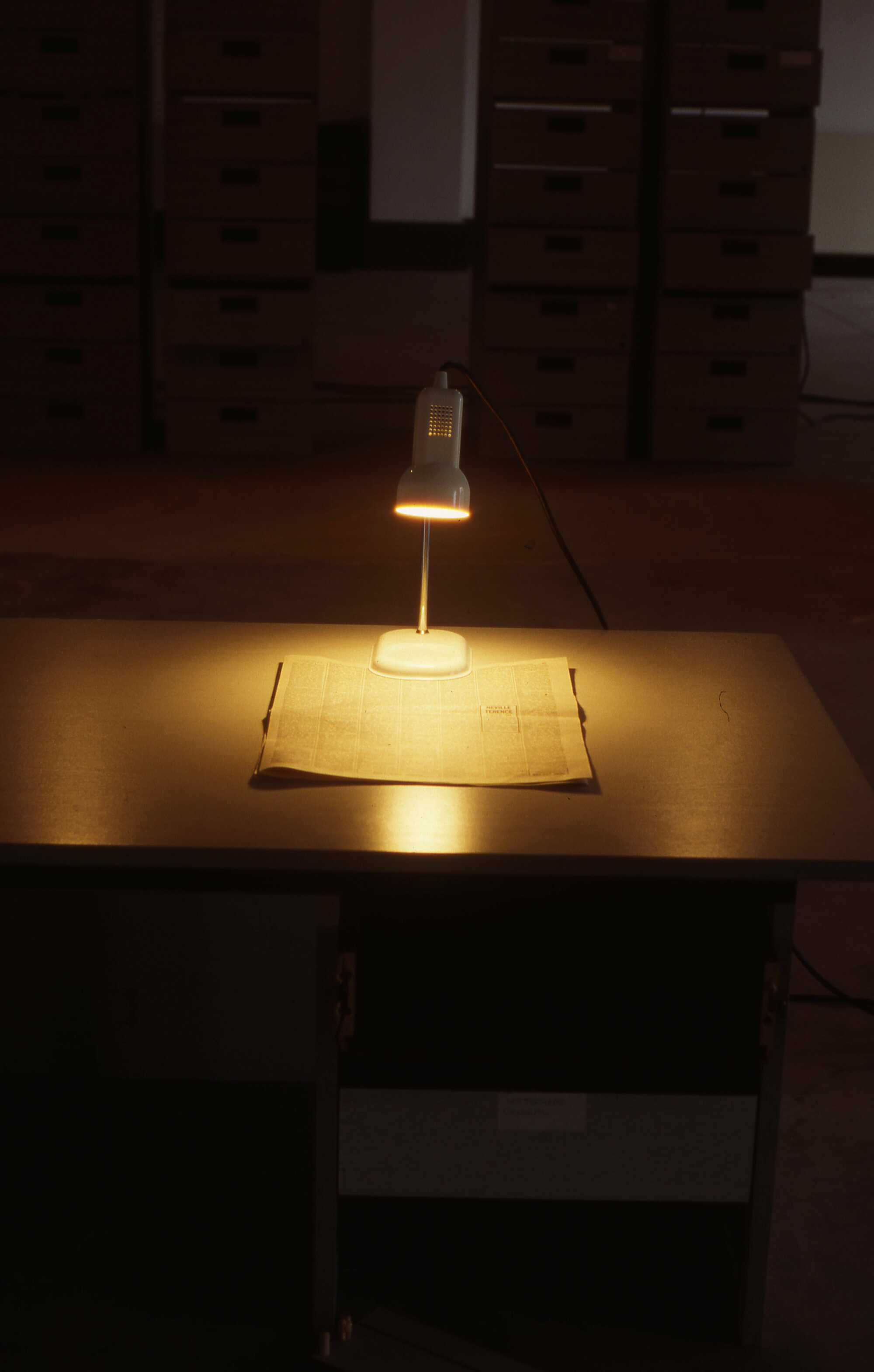 Site-specific installation constructed from office furniture found abandoned in the site, and with lights added to produce a memorial to those who worked in the office. The page on the desk was from the obituary section of the local newspaper