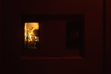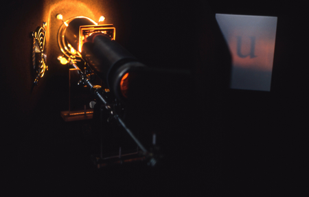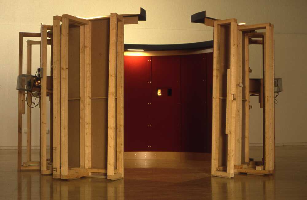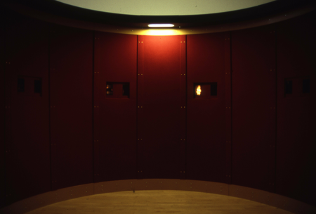 A three-quarter circular structure, the outside roughly finished and with the structures and cabling for the interior elements visible. The inside wall was faced with red linen, and with six cabinets inset in the wall. Each cabinet contained a constructed slide projector (light, metal tube, 35mm slide, mirror), and these threw the image of a single letter into the opposite side of the cabinet. Each letter was from the word 'museum'. The interiors of the cabinets were faced with black linen.