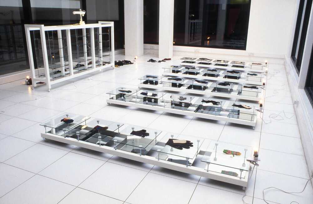 This work began with the collection of single gloves found abandoned on walks through the city of Liverpool with Janet Farahar. When the total of found gloves reached 200 we decided to produce a work from the dicoveries, and, as what had drawn us to the gloves in the first place was their connection to a missing owner as seen by their size, decoration etc., we wished to play on the idea of the gloves being the traces of a tragic event.