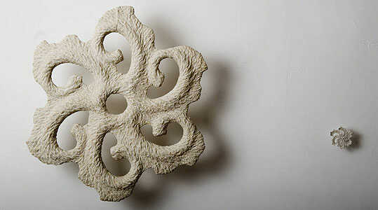 Ein winziges, gehäkeltes Spitzendeckchen, dessen Ornamentik an gotische Maßwerke erinnert, ist in der Umsetzung vergrößert, wird jedoch durch die Oberflächenstruktur wie unscharf wahrgenommen. Hauchdünn gearbeitet zeigt es die Grenze von Fleiss zum Irrsinn auf.