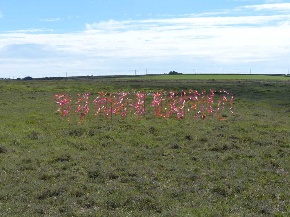 Wind installation on Woon Gumpus Common, Cornwall, using tape tied to canes. The movement of the wind created the illusion of figures, sometimes dancing, sometimes fighting. From other angles the work appeared as a drawing or on fire.