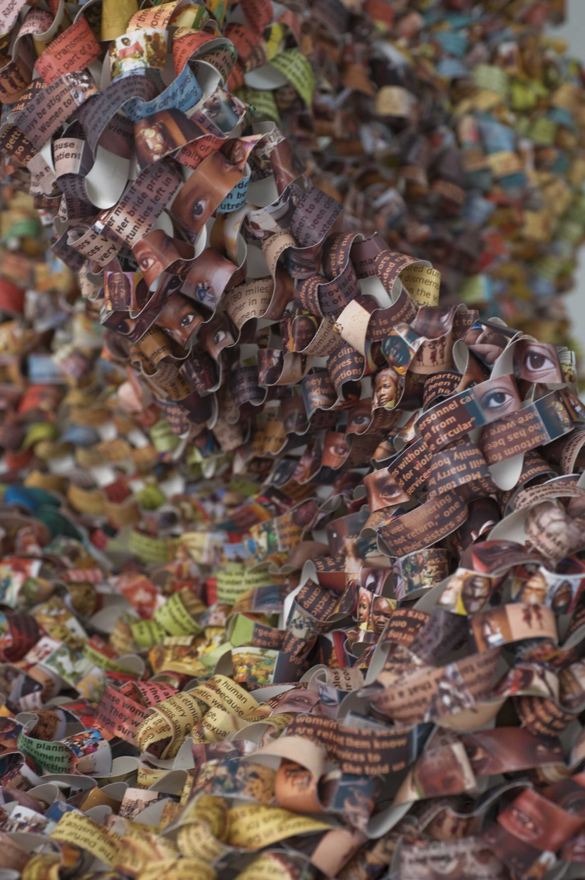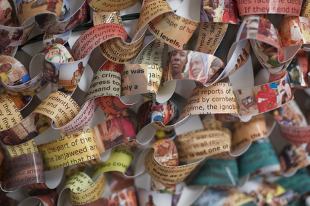 In this artwork I have knitted together images of Darfurian girls and women cultivating farmlands or seeking water and firewood with their traumatic stories of mass rape and violence.