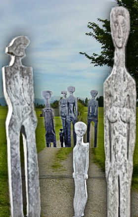 Flucht und Zuflucht< „ ….Ich war fremd und Ihr habt mich aufgenommen………………… (Matth.. 25, 31-46 ). Flüchtlingsgruppe in Travertin und schwarzem Granit; Serie : Kunst für den Frieden