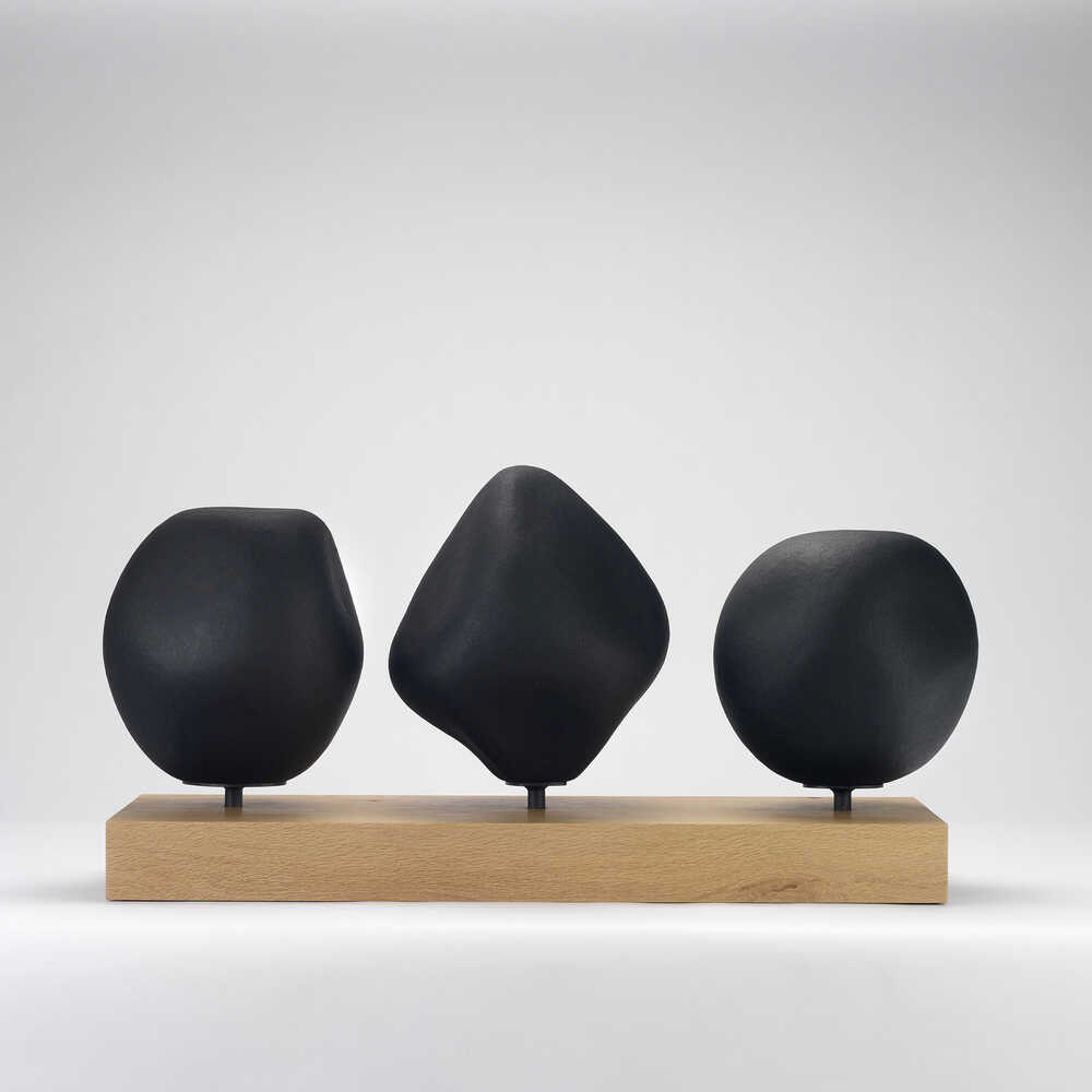 Media: Glass, free blown and hot shaped. Surface structured after cooling. The glass bodies are mounted on the wooden base with iron bearer.