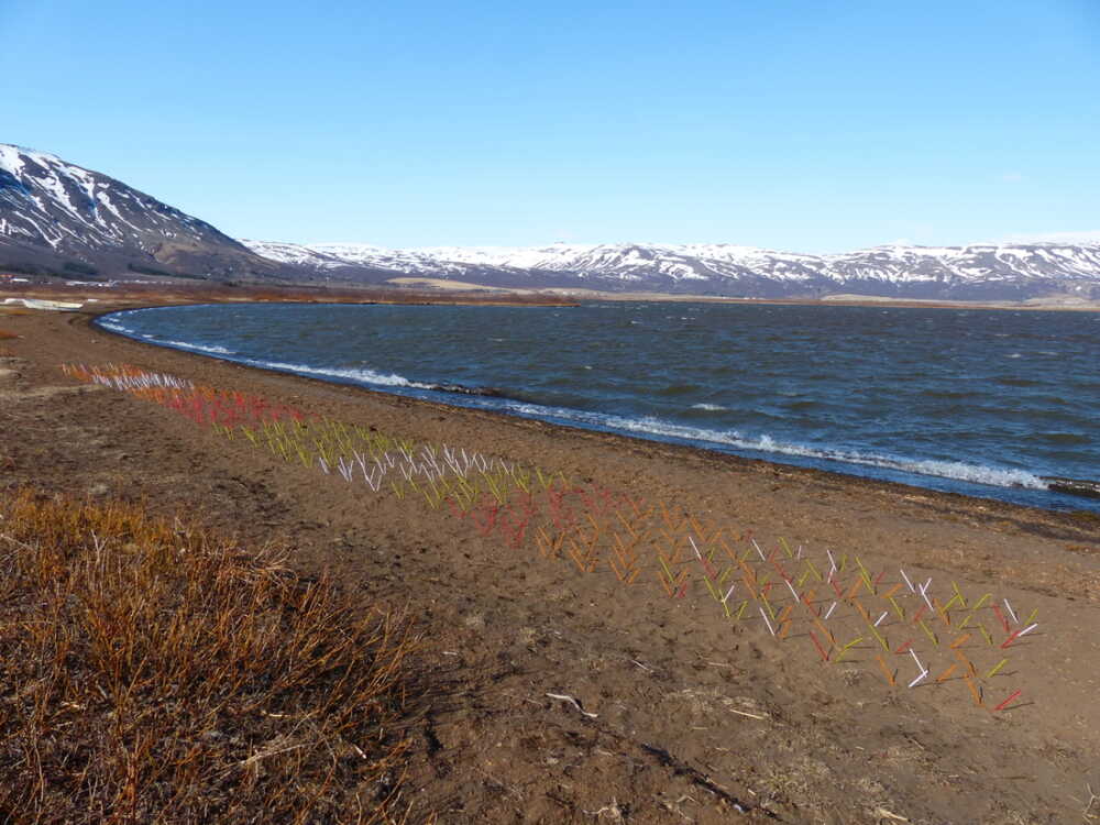 Drinking straws are chosen to reflect the colours of the changing seasons from winter to summer, in harmony with their surroundings. Set in the sand in pairs both the colours and the jaunty angles suggest cocktail drinks, knitting needles, stitches and fish scales. From some angles they are darker, brighter, suggesting plastic, weaving, sun beds arranged to take in the view. From other angles they are barely there, like a magical apparition, coloured grasses, delicate soft threads or wool. Associations suggest the wool, knitting and fishing industries of Iceland and the nature park and resort aspect of the location, with the installation taking in the breathtaking view. The function of straws drawing up liquid also links to plants drawing up fluid and to the flavour of the land.