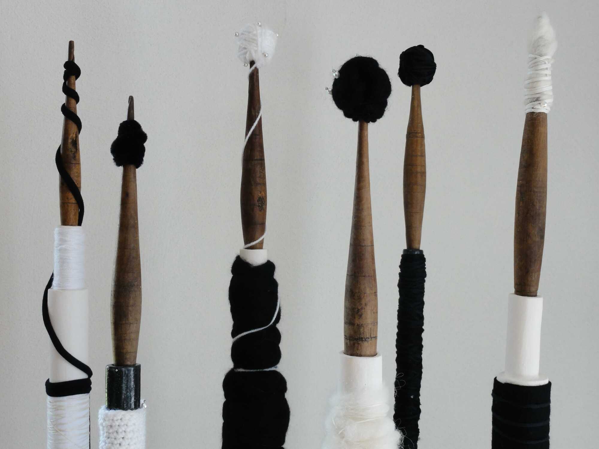 Stelengruppe aus alten Spindeln, Ton, Wolle, Perlen, Metallständern