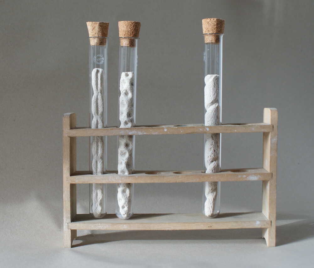 Installation with testtubes (limestone, wood and…