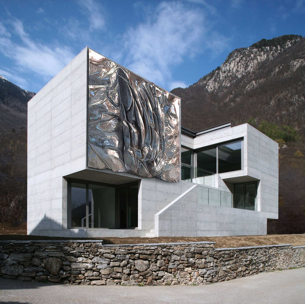 Architektur und Kunst verschmelzen bei meinem Objekt zu einer künstlerischen Einheit. Das Original strotoplstische Bild wurde auf die notwendige Fassadengröße transformiert und in einem Stück gusstechnisch in Aluminum poliert hergestellt.Transport und Montage erfolgte über Lastenhubschrauber.