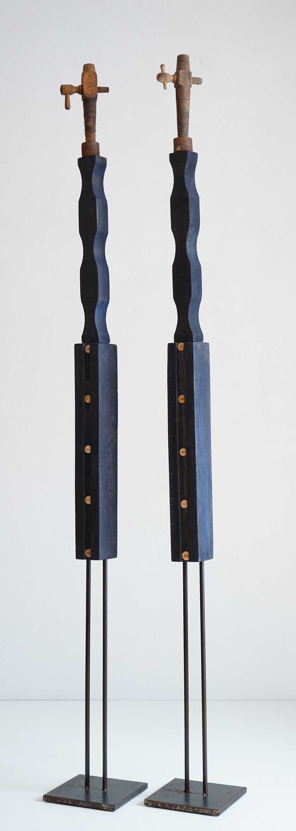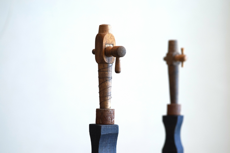 alte Zapfhähne, Holz, Korken, Metallständer