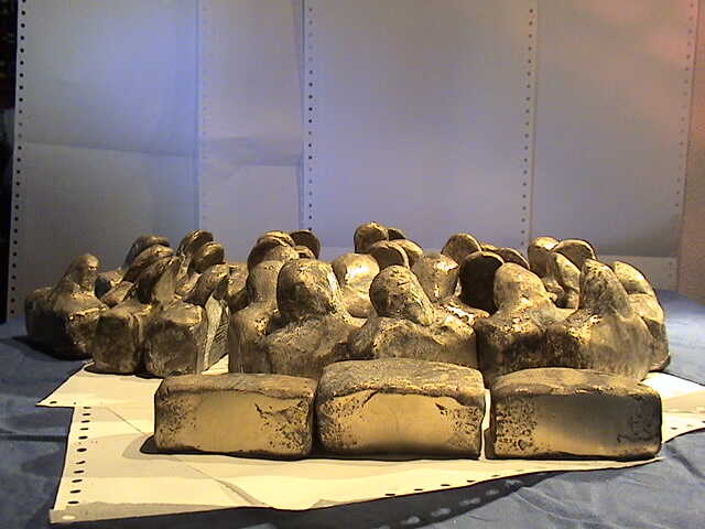 Bürokraten bei der Arbeit dargestellt als "Stempelmänner". Bronzebüsten