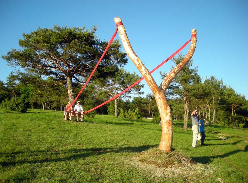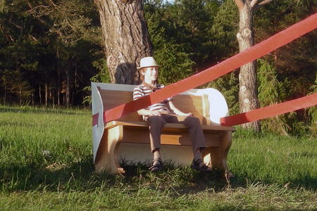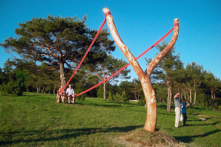 Material: tree trunk, rubber, bench, paint