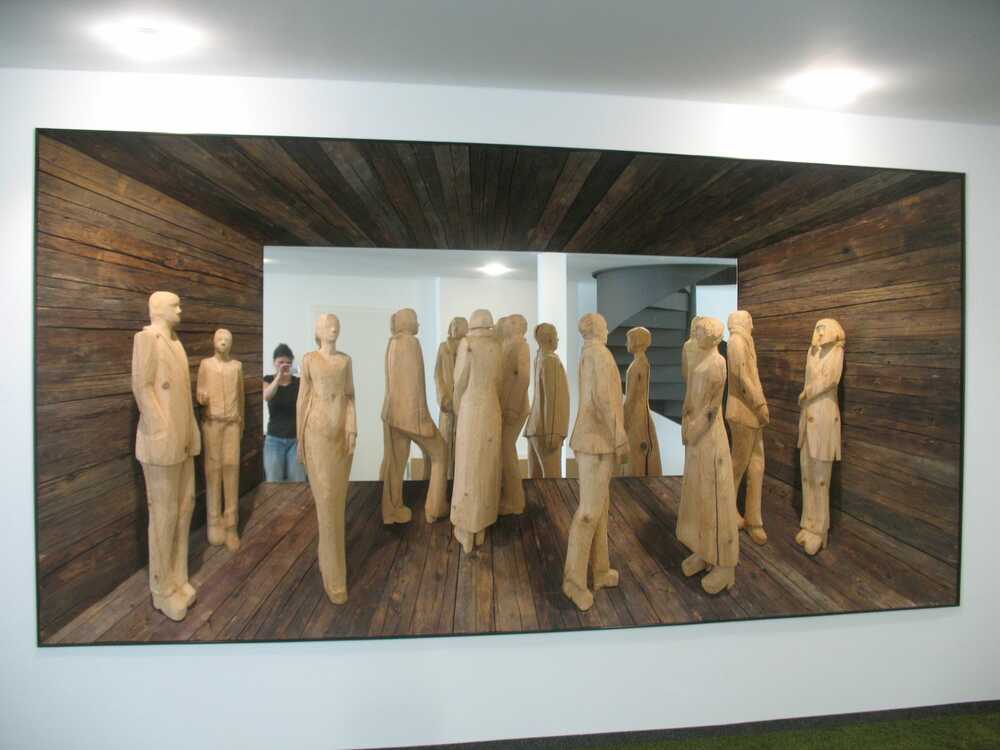 "Begegnung", Wandgestaltung, ausschließlich aus Abbruchbalken bestehen