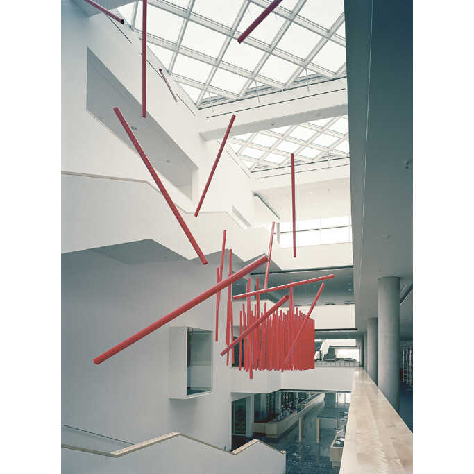 / Die pulverbeschichteten roten Aluminiumrohre werden durch die im Raum vorhandenen Luftströmungen in eine langsame Drehbewegung um ihren Aufhängepunkt versetzt. /