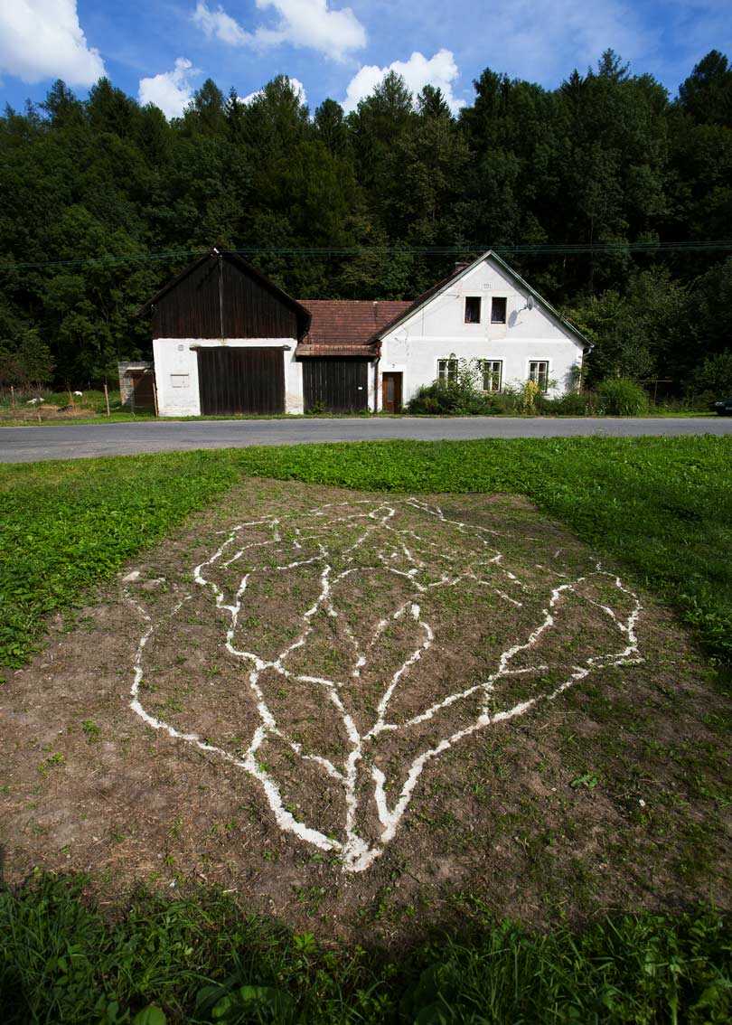 Riverdelta, Harry Schumacher was invited for a symposium in Trstenice in the Czech Republic. The village stretches along a small, partly dry river in an oblong valley. The East/West trade route through the village is visualized as the connection in two directions between two points. The work consists of two V-shaped riverdelta's, which only touch in one place. In a riverdelta water searches its way from high to low. The liquid in the artwork flows against the current. The area is the center of water flowing in two opposite directions, to the North Sea and to the Black Sea. The map forms the Czech Republic, still struggling between East and West. I choose to make the work on location and made every day the trip through the village with a trolley to get into contact with the people as a part of the artwork.