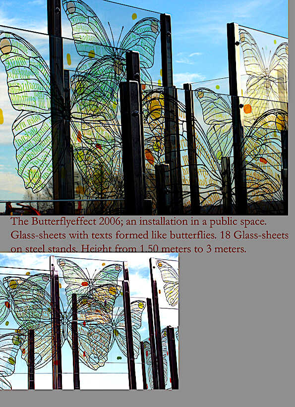 The Butterflyeffect/ 12 stands with a serigraphy on glass-sheets. One sheet 80cm x 60 cm. Situated on the terrace of university students´ recidence.