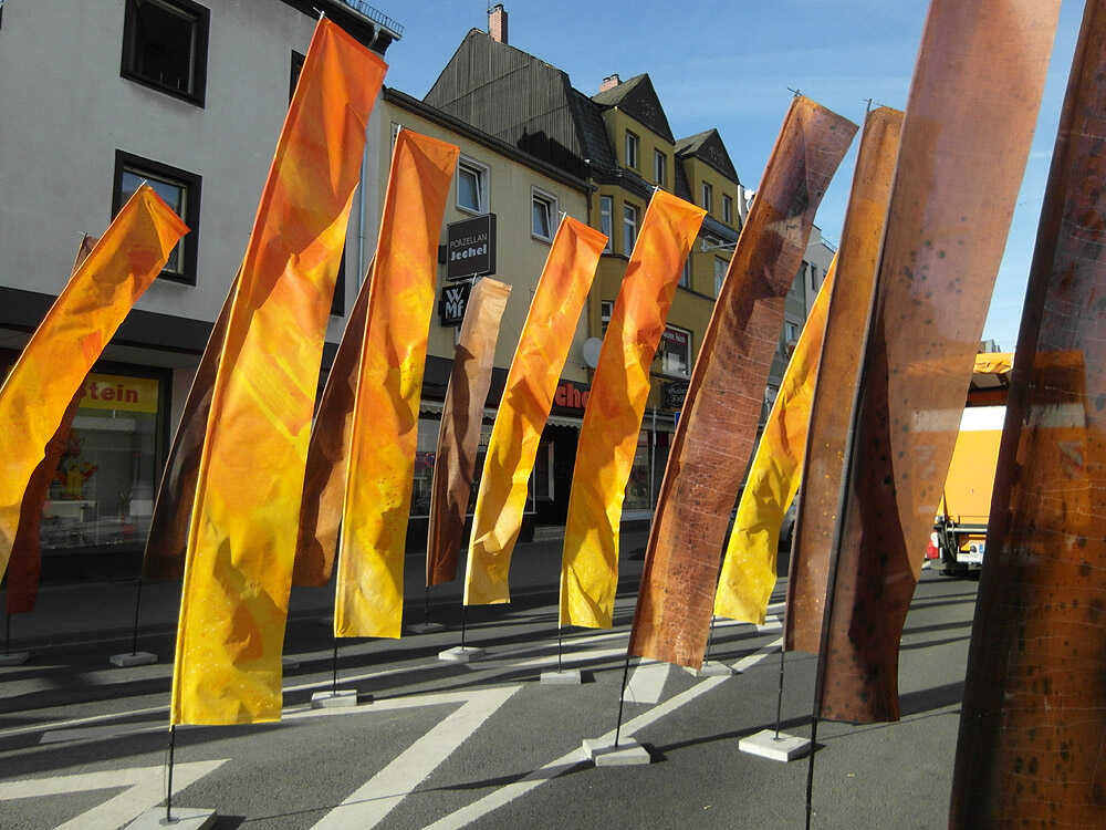 Maltechnik auf Fahnentuch, GFK-Gestänge.