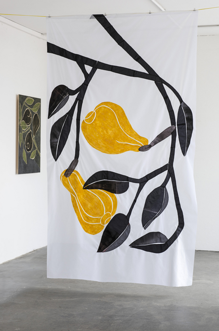 "Früchte und Zweige im Bildraum verortet: Meine textilen Arbeiten vereinen Abstraktion und Gegenständlichkeit – Spiegel der Natur." (Martina Geist)