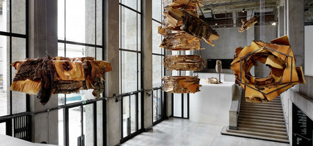 Deployed in the air, above the landing of Palais de Tokyo’s main staircase and its surrounding space, the installation conceived by Anita Molinero is made up of a large sculpture of burnt polyfoam, a kind of fossilised planet or spaceship with hesitant technology. Like a mute “guardian”, a chained sculpture covered with fur watches over this aerial scene with its urban apocalyptic, Z-movie appearance.