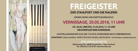 Bedingungslos, voller Mut und Intuition überschreitet Jürgen Heinz mit seinen MOVING SCULPTURES Grenzen, erzwingt eine radikale Befreiung des Stahls aus Schwere und Starrheit. Er überzeichnet den Ausbruch aus dem Erwarteten in einer Bewegungslyrik von fast schmerzender Poesie und Zartheit. Kommunikation in subtil formulierten Bewegungsavancen. Virtuoses Spiel mit Gewicht und Form, Harmonien und Kontrasten, Gravitation und Schwerelosigkeit begegnet leidenschaftlichem Duktus und Phantasie aus FRAU SEIN MENSCH SEIN. Die Malerin Anette Bundschuh ist auch Zeichnerin. Ihre Akte sind von leichter Hand, berühren in ihrer Menschlichkeit und Sensualität. Manche ihrer Figuren tauchen auf aus dem Nichts, voller Geheimnis und Symbolkraft. Sie liebt explosive Farbplatzierungen, klare Konturen, verhüllt mit Andeutungen und Transparenzen. Ihre Frauenbilder sind voll archaischer Universalität und Vielschichtigkeit, auch im malerischen Wortsinn.