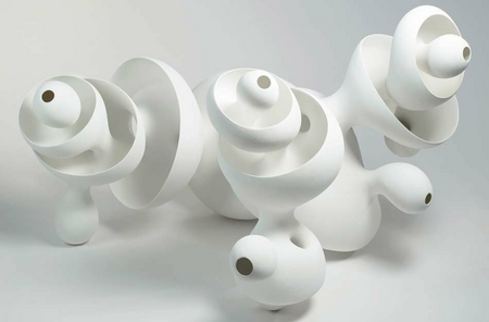 "Meine Faszination gilt dem Verhältnis zwischen inner­lichen und äußer­lichen Wirklich­keiten, dem Dual­ismus zwischen Innen und Außen, Inhalt und Form, Gefühl und Gestalt, Eindruck und Ausdruck. Meine Arbeit reflek­tiert meine inneren Formen­land­schaften. Körper, in denen Anwesen­heit und Abwesenheit zusammen­kommen.", sagt die schwe­dische Bild­hauerin Eva Hild (*1966) über ihre Arbeit. Ihre Skulpturen ähneln organischen Körpern, die sich unter dem Einfluss inneren und äußeren Drucks zu verändern schei­nen. Mittels einer dünnen Haut definiert die Künstlerin eine fluktu­ierende Grenze zwischen dem Innen und Außen, die sich in Durch­brüchen, Über­gängen und Umstülp­ungen stellen­weise auf­löst. Dadurch erscheint die räumliche Kon­stel­lation spannungs­voll, mehr­deutig und fragil.